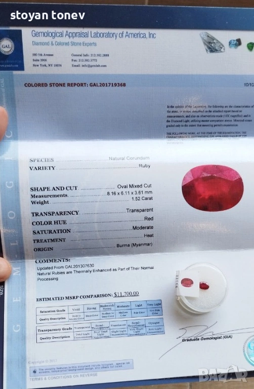 Произход: Мианмар (Бирма) – най-престижният и желан източник за рубини в света Сертификат: Официален сертификат от Gemological Appraisal Laboratory of America (GAL) – Ню Йорк