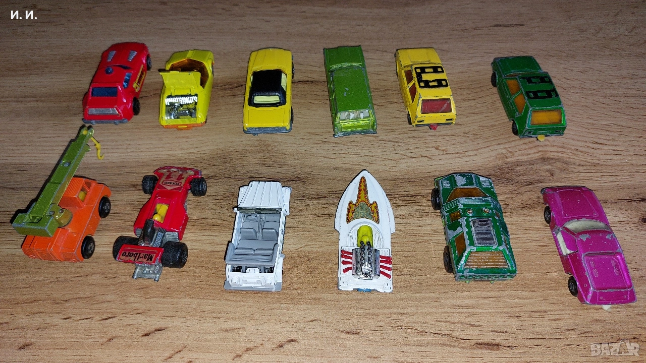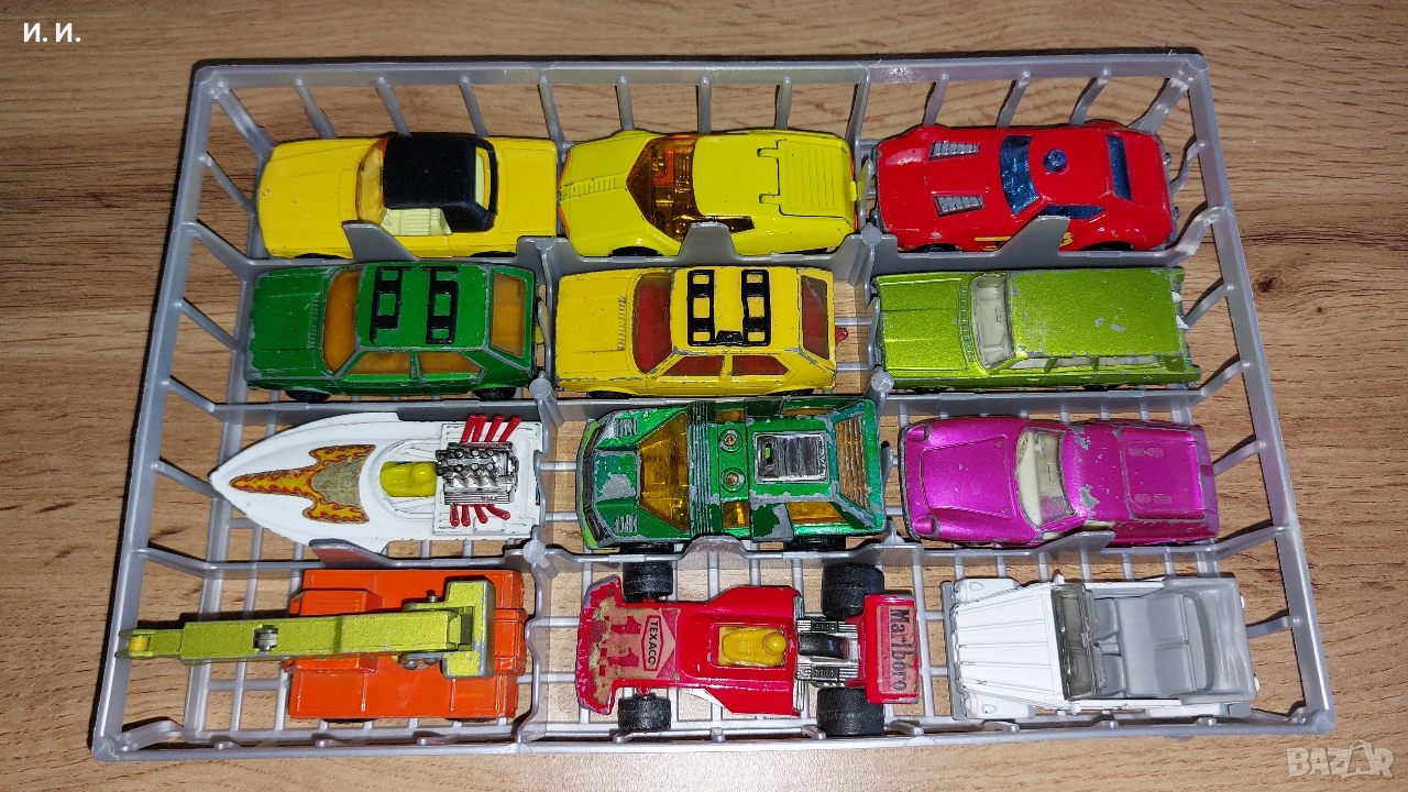 Matchbox, подредени в пластмасов органайзер. Повечето модели са част от популярните серии Superfast и 1-75, произвеждани основно през 70-те години на миналия век. Ето идентифицираните модели, подредени по редове от ляво на дясно: Първи ред (най-горе): Mercedes 350 SL (#6): Жълта количка с черен покрив, пусната за първи път около 1973-1974 г. като част от серията Superfast. Datsun 126X (#33): Футуристичен жълт модел от 1973 г. с отварящ се заден капак. Fire Chief (#64): Червен спортен автомобил с надписи "Fire Chief" и синя сигнална лампа на покрива, модел от 1976 г.. Втори ред: Volkswagen Golf (#7) - Зелен: Ранен модел от 1976 г., често наричан "VW Golf Mk1". Volkswagen Golf (#7) - Жълт: Вариант на същия модел от 1978 г., често продаван с пластмасови сърфове на покрива (тук липсват). Mercury Station Wagon (#73): Светлозелено комби с фигурки на кучета, които се виждат през задния прозорец. Трети ред: Seafire (#5): Бяла скоростна лодка с пламъци (Sea Fire) и червени детайли по двигателя, модел от 1975 г.. Planet Scout (#59): Зелено научнофантастично превозно средство (космическа кола) от 1975 г.. Lotus Europa (#5): Розова спортна количка, първоначално издадена през 1969 г.. Четвърти ред (най-долу): Iron Fairy Crane (#42): Оранжев мобилен кран с жълто подвижно рамо, модел от края на 60-те и началото на 70-те години. Formula 5000 (#36): Червен болид от Формула 1 с рекламни стикери Texaco и Marlboro, издаден през 1975 г.. Volkswagen Type 181 "Thing": Бяла количка с открит покрив, базирана на класическия офроуд модел на VW. Някои от количките са със забележки. Състоянието е видно от снимките. Ако проявявате интерес пишете. Само лично предаване! Без куриери!