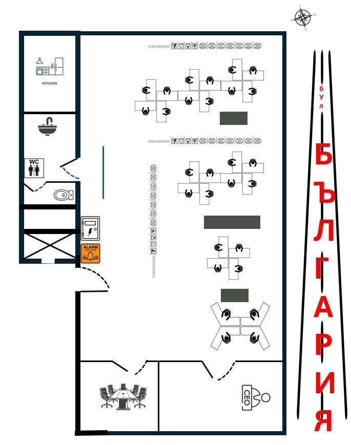 - Един кабинет на управителя, който е с размери достатъчни за обособяване на допълнителна конферентна зала, отново отделен чрез темперирани стъкла;