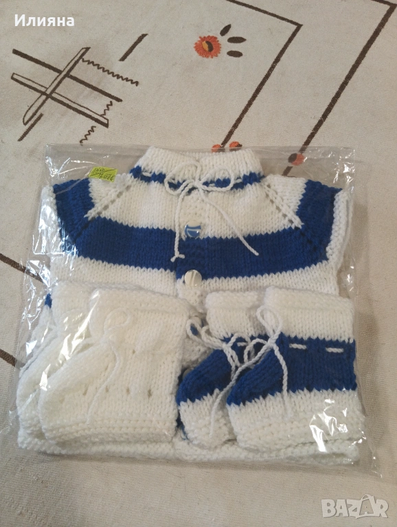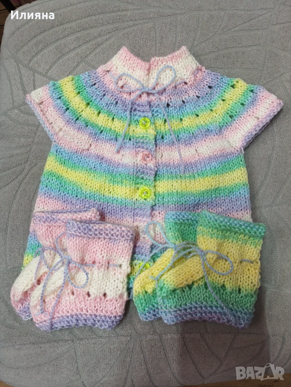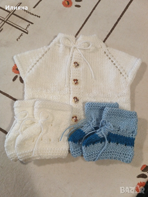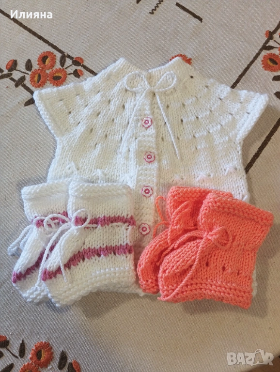 Продавам ръчно изплетени бебешки елечета,в комплект с два чифта търлъчки.Нови!