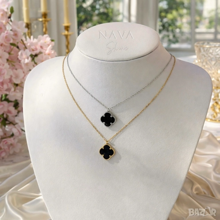 Колие от медицинска стомана с черна детелина - златно и сребърно → Обява 54156839