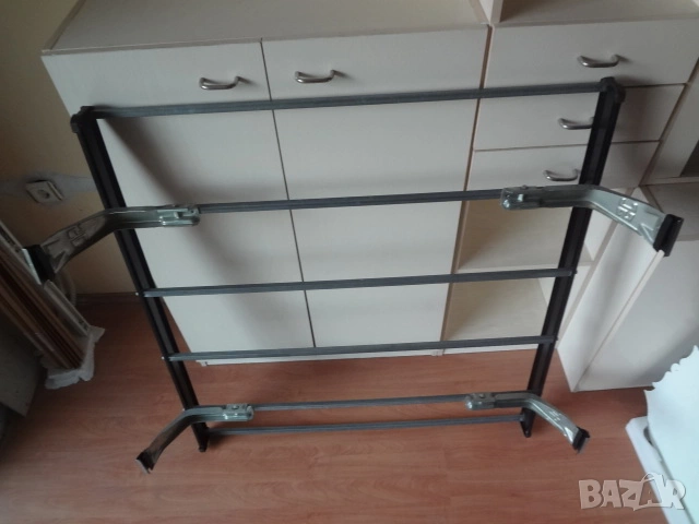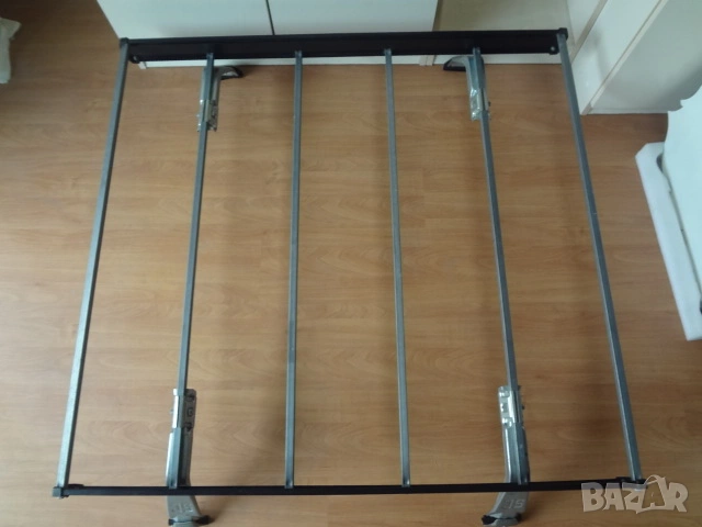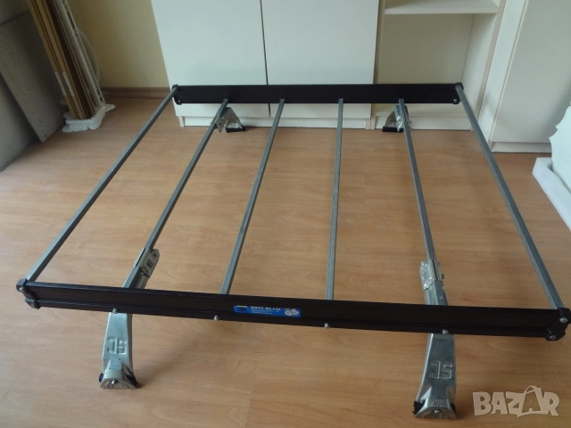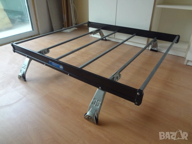 Автомобилен настройващ се таванен багажник в отлично състояние, неразличим от чисто нов.. Изработен е от алуминиеви напречни и надлъжни греди образуващи корито. Произведен е в Швеция. Подходящ е за превоз на всякакви видове товари. Може да се разглобява на съставните си части много лесно. Размерите са следните : дължина по ширина само на коритото отгоре - 104 х 100 см.; разстояние между захватите - 104 см., като може да се настройва чрез плъзгане навътре или навън според размера на тавана на автомобила.