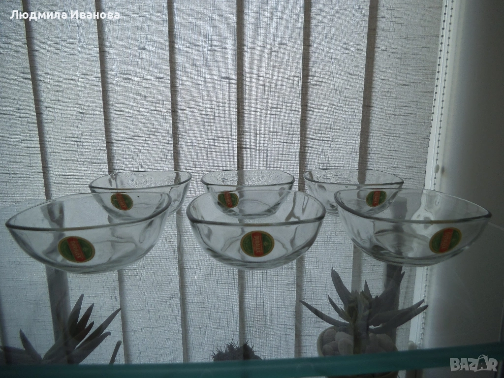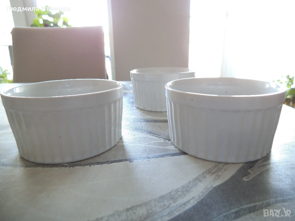 7) 6 броя стъклени купички "Duralex", размери 11/6,5 см, цена - 4 лв./бр.; 3 броя бели порцеланови купички за крем-карамел, височина 5 см, диаметър 9 см, цена - 2 лв./бр.
