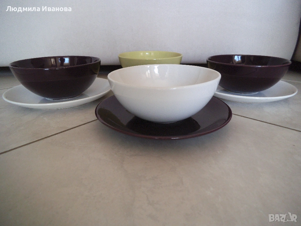 2) Комплект от две бели, една лилава и една светлозелена керамична чиния, диаметър 21 см, цена - 5 лв./бр.; 2 броя чинии в жълто и розово, диаметър 20 см, цена - 3 лв./бр.; синя керамична чиния, диаметър 20 см, цена - 3 лв.