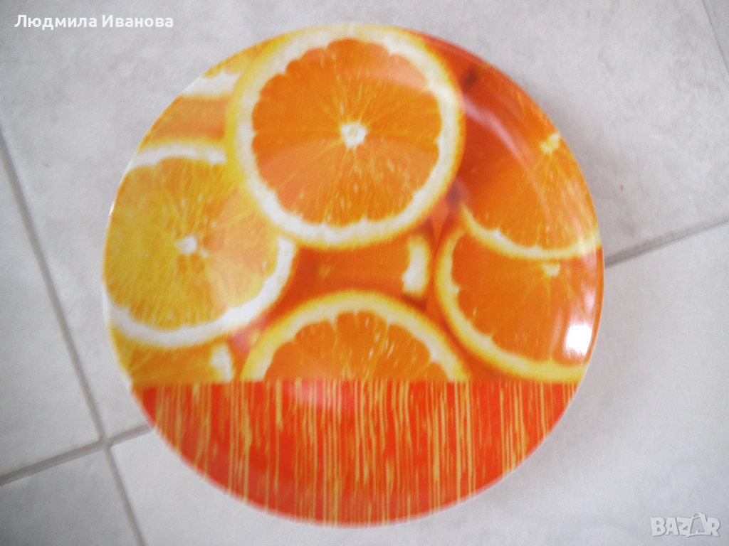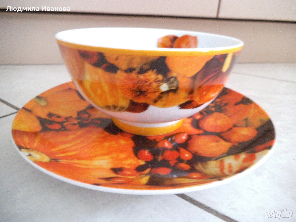 8) Комплект порцеланова купа и чиния на тикви, размери: купа - височина 7.5 см, диаметър 14 см; чиния - диаметър 21 см, цена на комплекта - 10 лв.; порцеланова чиния на портокали, диаметър 21 см, цена - 5 лв.