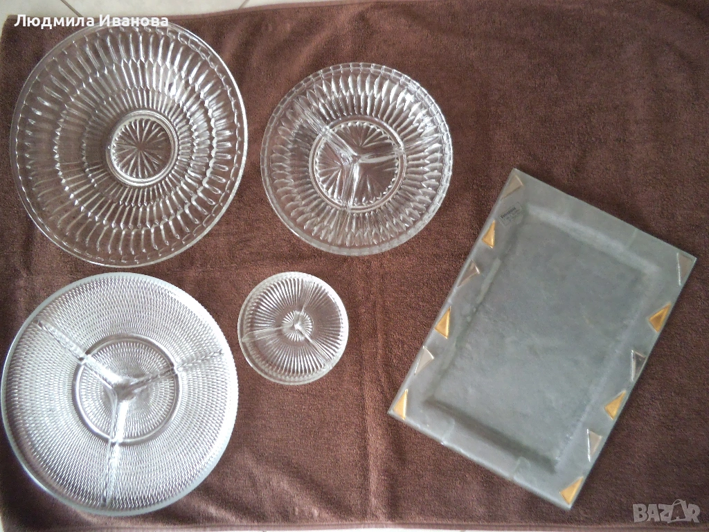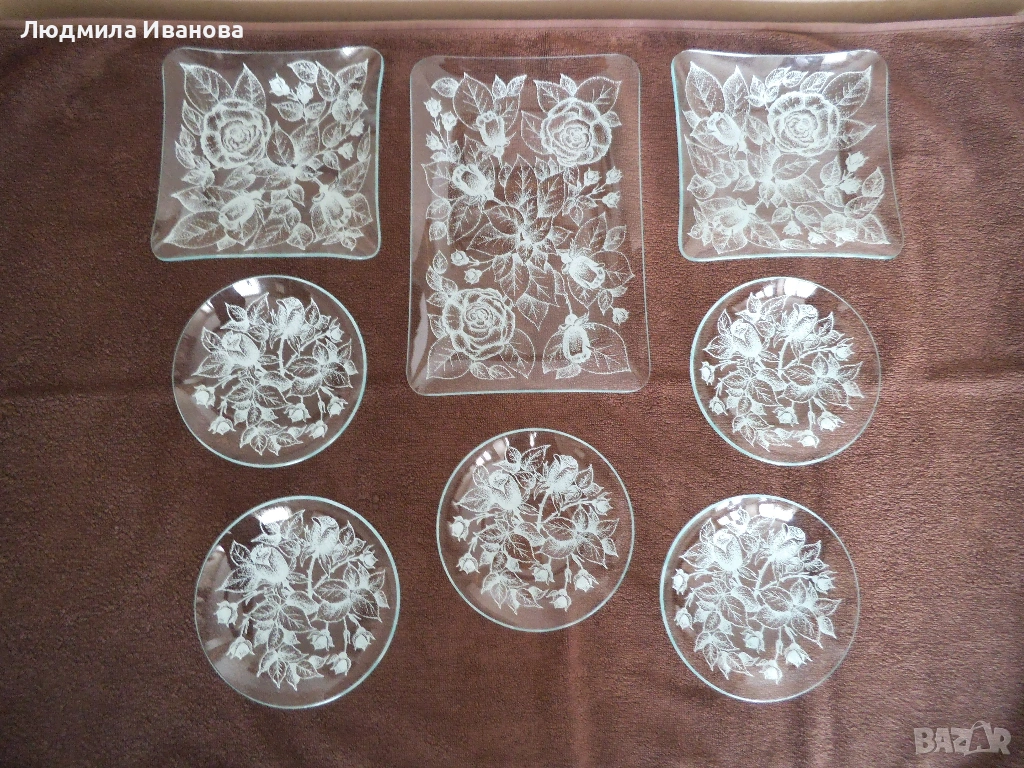 9) Сервиз от рисувано стъкло в бяло, състоящ се от 8 части: голяма правоъгълна чиния, размери 30/20 см; две квадратни чинии, размери 19/19 см; пет малки кръгли чинийки, диаметър 16 см, цена на комплекта - 55 лв.