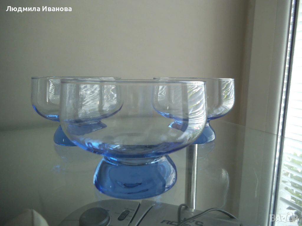 4) 3 броя стъклени чаши за сладолед, крем и пр., размери: височина 9 см, диаметър 11 см, вместимост 400 мл, цена - 3 лв./бр.