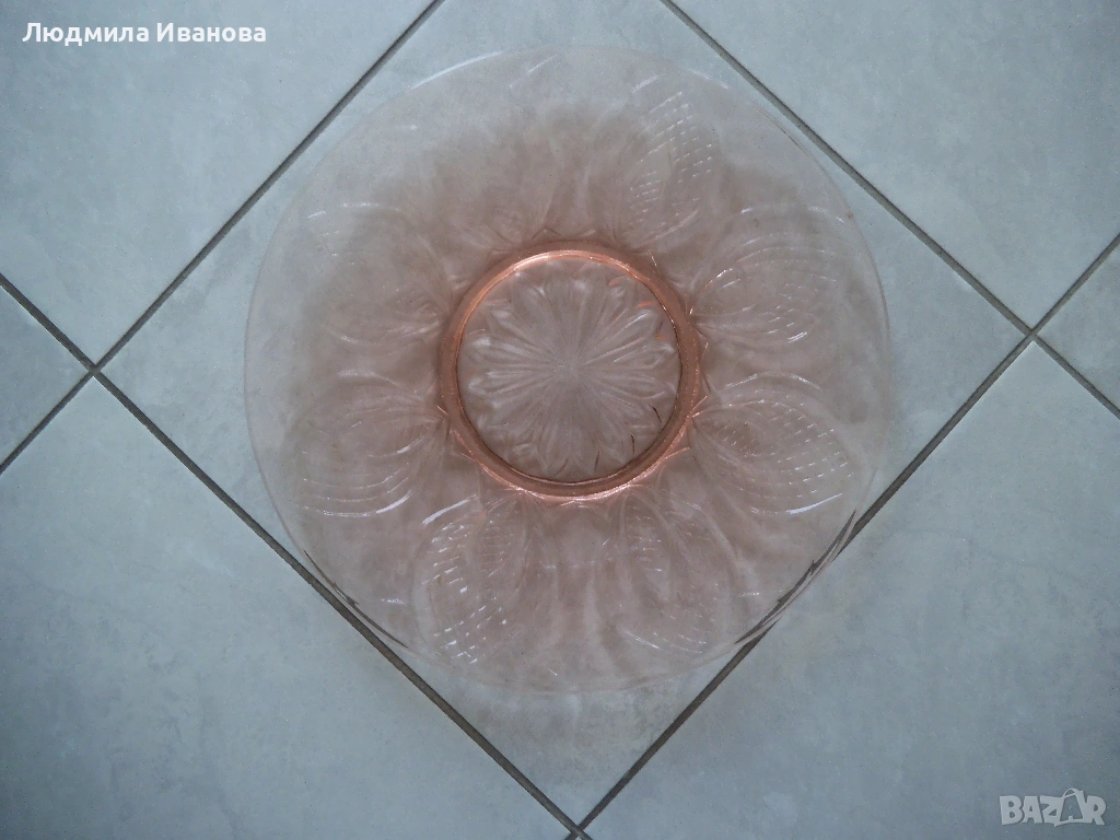 3) Голяма стъклена десертна чиния в розово, диаметър 35 см; голяма стъклена десертна чиния, диаметър 32 см, цена - 10 лв./бр.