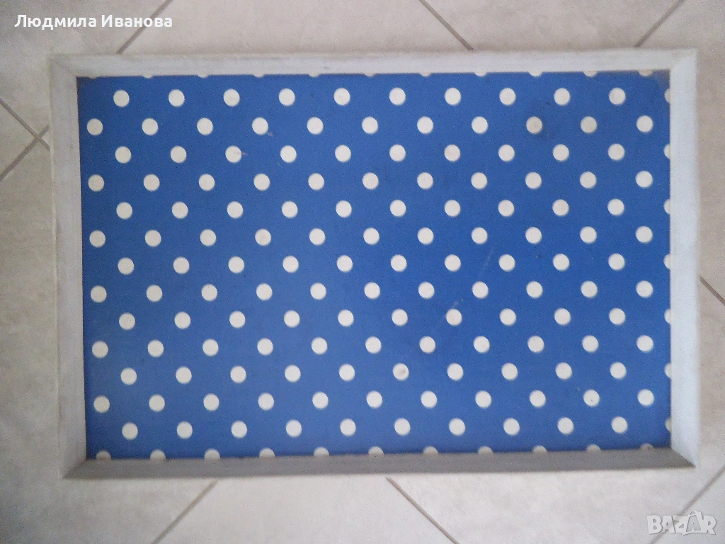 5) Голям дървен поднос в синьо и бяло, дължина 55 см, ширина 36 см, височина 4 см, цена - 10 лв.; стъклен поднос с орнаменти, размери 25/35 см, цена - 15 лв.