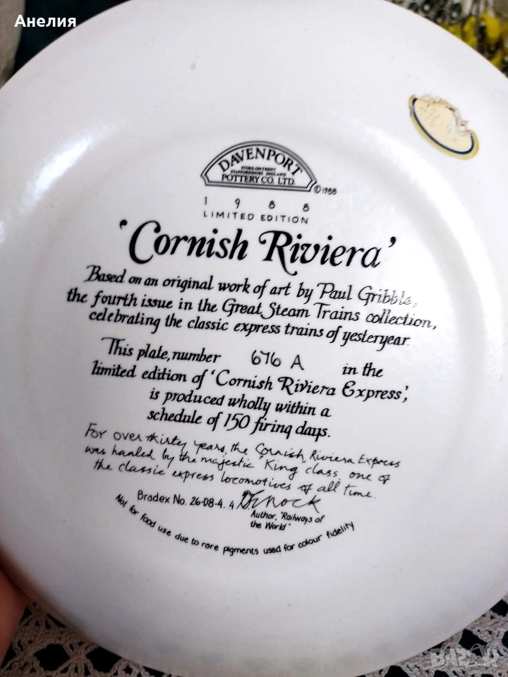 Колекционерска чиния "Cornish Riviera" от Davenport Pottery Co. Ltd., част от лимитирана серия от 1988 г.