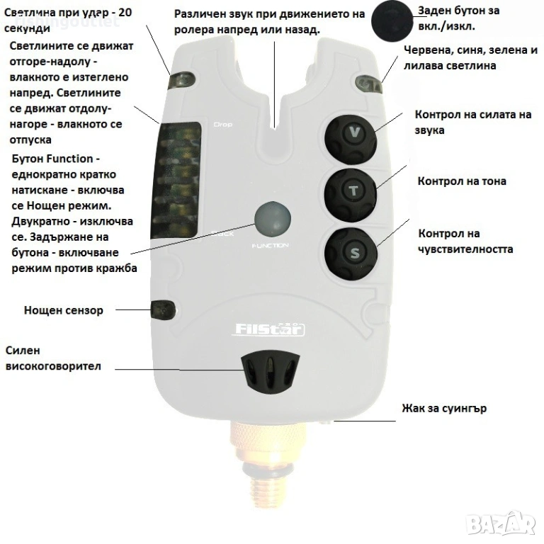 Как да активираме алармата срещу кражба на пръчката? Поставете пръста си върху лампичката и натиснете и задръжте бутон Function, докато алармата изпиука няколко пъти. Поставете въдицата върху алармата. Функцията е активирана и ако вдигнете пръчката, алармата ще се задейства. Дезактивирането става, като натиснете и задържите бутон Function и алармата изпищи 3 пъти.