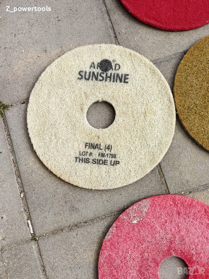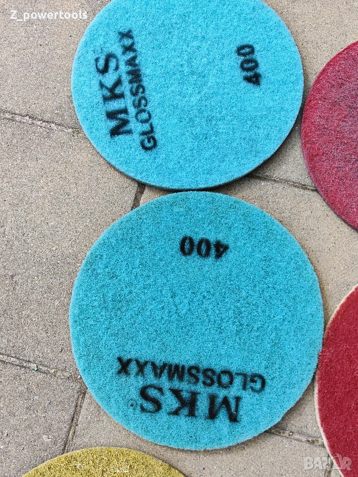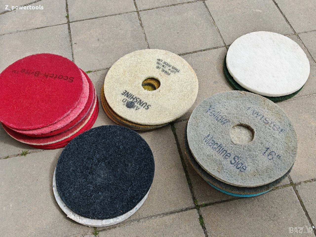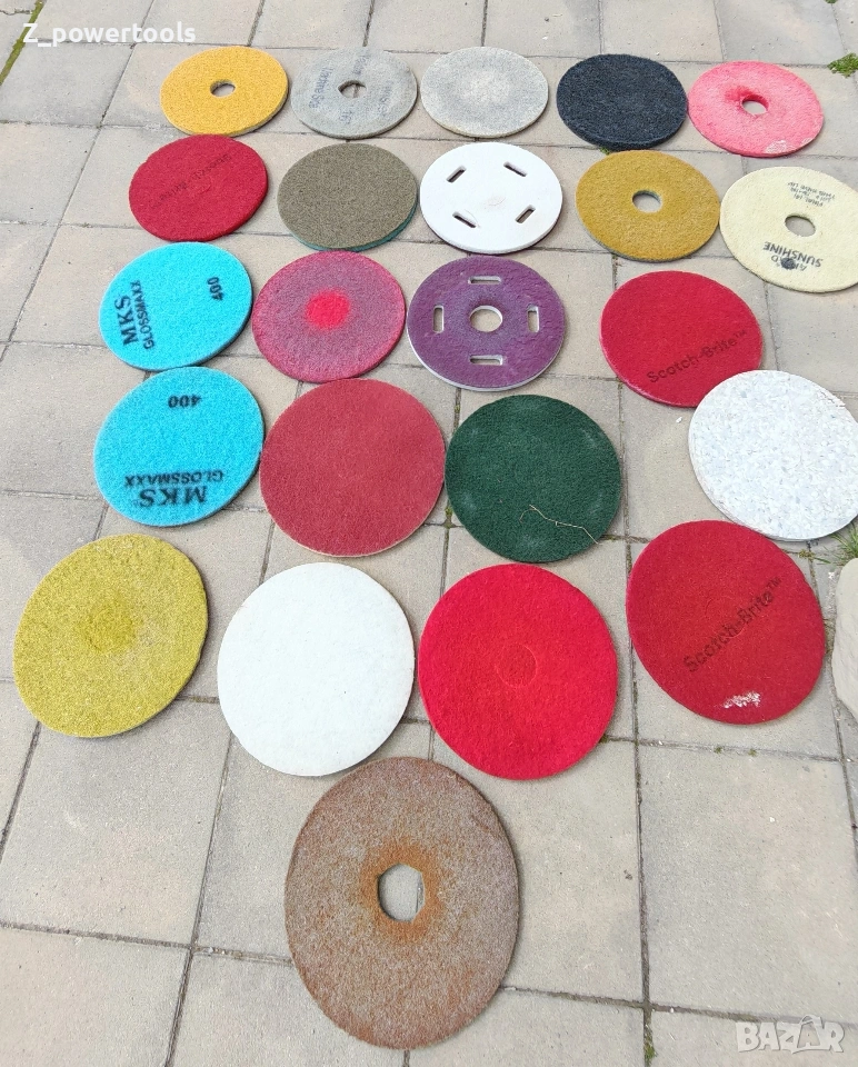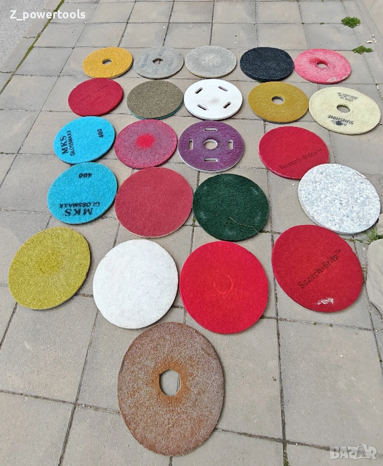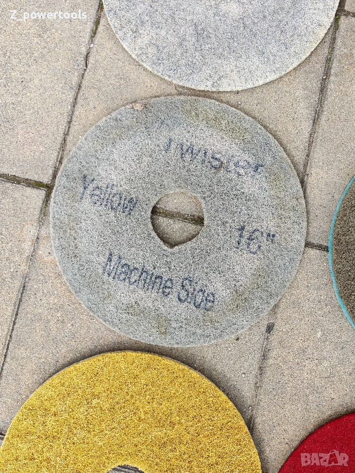 пълен комплект от 21 броя професионални падове (дискове) за подопочистващи машини и полиращи автомати. Дисковете са с диаметър 16 инча (406 мм) и са предназначени за пълния спектър от дейности – от основно почистване до огледално полиране на бетон, мозайка, мрамор и индустриални подове. Комплектът включва висококачествени консумативи на водещи марки като 3M Scotch-Brite, Twister и MKS. Спецификация на комплекта (общо 21 броя): Диамантени и специализирани падове: 3 бр. Twister / Sunshine (Сиви/Бежови) – професионални диамантени дискове за кристализация и висок гланц. 2 бр. MKS Glossmaxx 400 (Сини) – за прецизно шлифоване и подготовка. 1 бр. Final (4) – специализиран пад за финална обработка. Падове за почистване и поддръжка: 6 бр. Червени (Scotch-Brite и др.) – за стандартно мокро почистване. 3 бр. Жълти/Златисти – за фино полиране. 2 бр. Бели – за суха поддръжка и изкарване на блясък. 1 бр. Зелен – за интензивно търкане. 1 бр. Черен – за най-агресивно почистване и премахване на запечатки. 2 бр. Други (Лилав/Кафяв) – за специфични подови настилки. Състояние: Падовете са в отлично състояние, готови за директна употреба.