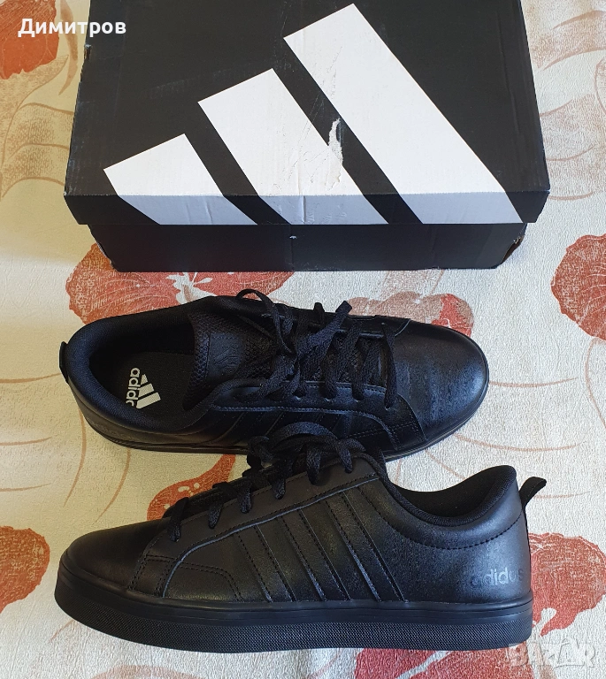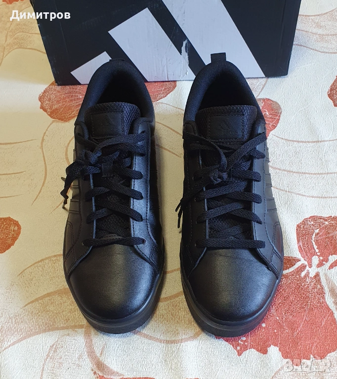 Кецове ADIDAS - нови, с кутия. Еко кожа, цвят - черен. Размер по етикет - 42 и 2/3, но отговаря на 43, 43 и 1/2. Стелка измерена от мен - 27,6 см.