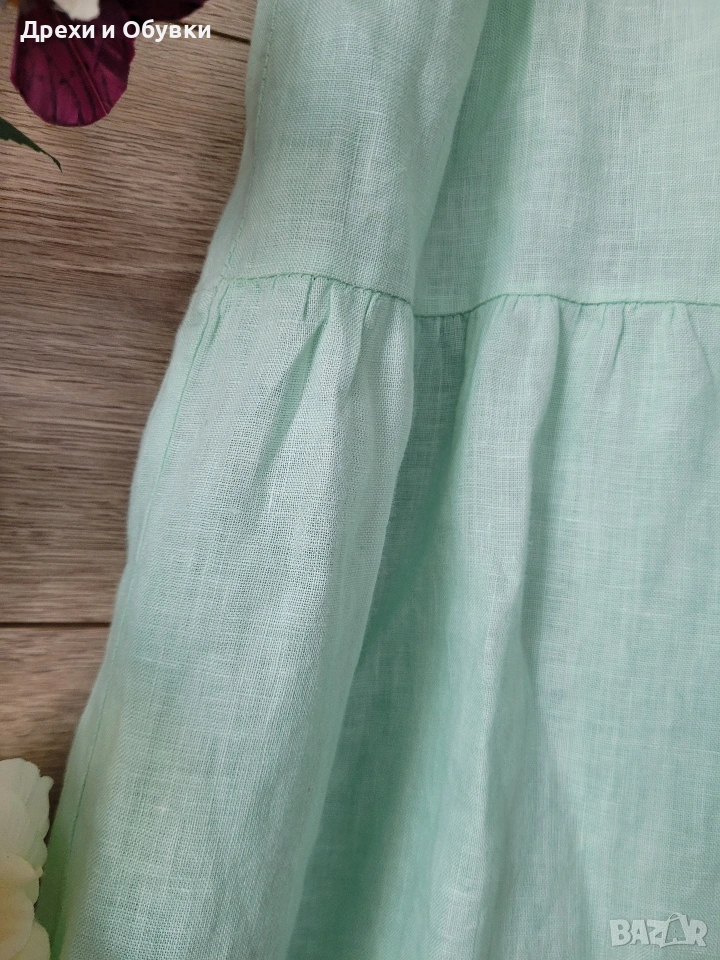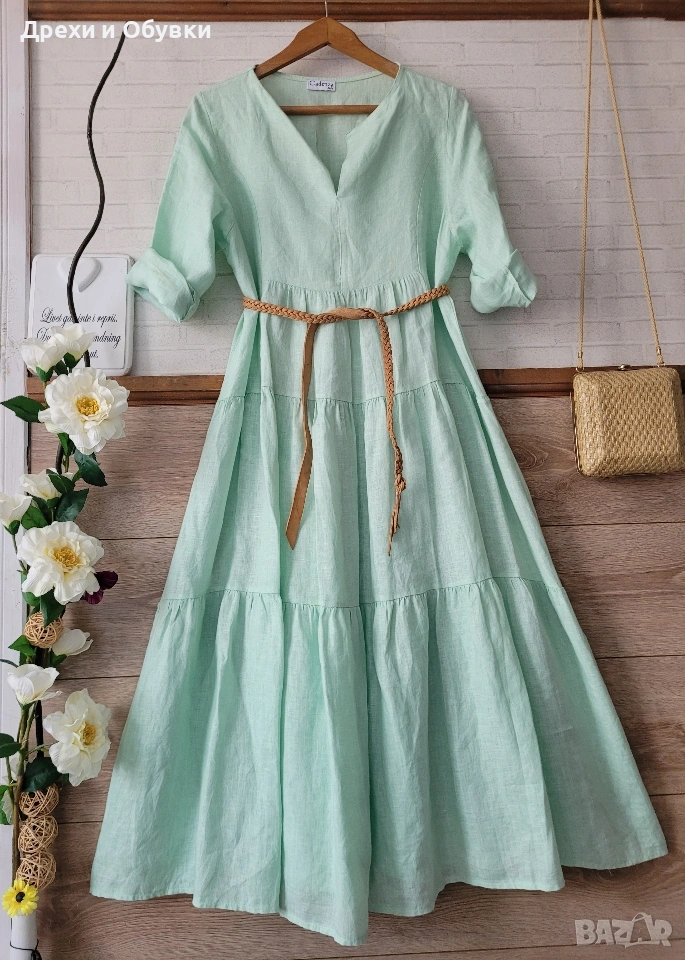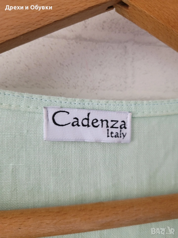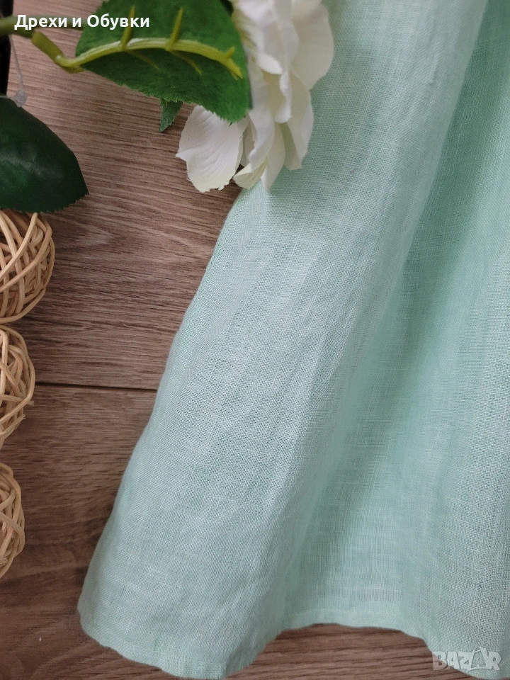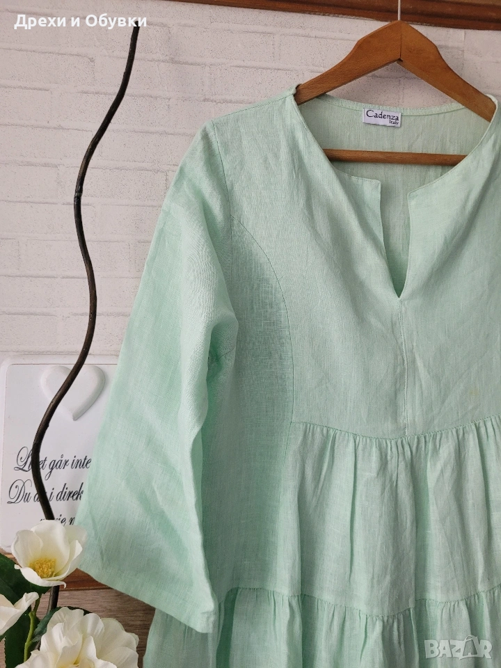 ленена рокля от Cadenza – съвършен баланс между комфорт, стил и италианско майсторство. Изработена от 100% висококачествен лен, роклята впечатлява с лекота и естествена текстура, която позволява на кожата да диша и осигурява усещане за прохлада дори в най-топлите дни. Нежният ментов нюанс придава свежест и финес, подчертавайки естествената женственост. V-образното деколте издължава линията на шията,. Меките набори в долната част създават красив обем и движение при всяка крачка. ✨ Произведена в Италия – символ на безкомпромисно качество и внимание към детайла ✨ 100% лен – естествена, дишаща и устойчива материя ✨ Универсален дизайн – подходящ както за ежедневие, така и за специални поводи Тази рокля е повече от дреха – тя е израз на стил, лекота и съвременна женственост с неподправен италиански почерк. Универсален размер Перфектна за М/Л Гръдна до 100см, дължина 106см Състоянив: не е носена Цена 60€
