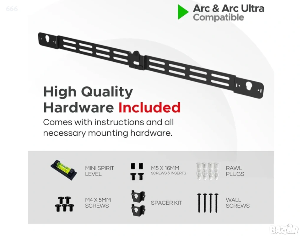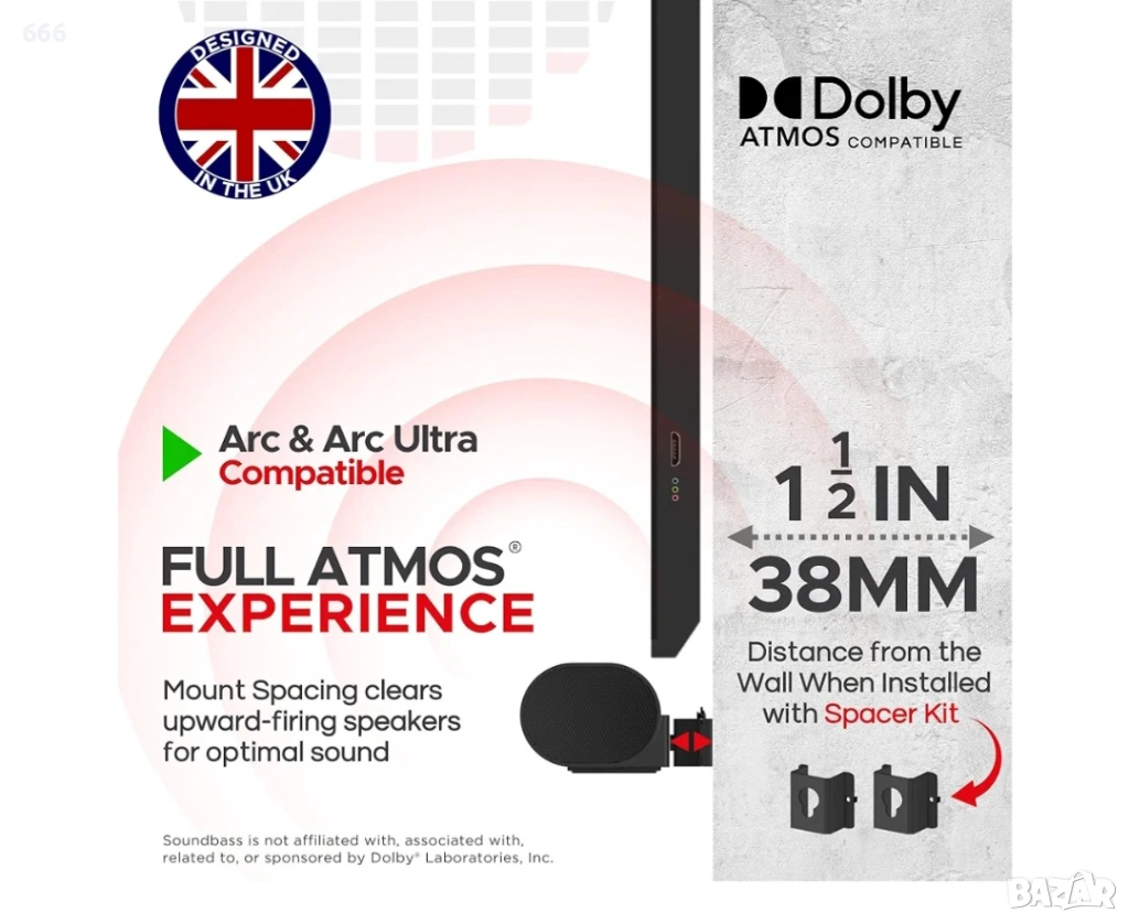 ИЗОБРАЗИТЕЛЕН ДИЗАЙН - Нашият уникален дизайн предлага две решения за монтаж - или препоръчителните 4 инча под телевизора, или с помощта на включените 38 мм дистанционни елементи можете да монтирате вашия Arc или Arc Ultra директно под телевизора. Дистанционните елементи ви позволяват да позиционирате високоговорителя леко напред, което гарантира, че високоговорителите, насочени нагоре, няма да бъдат блокирани от телевизора и ще получите пълния Dolby Atmos ефект!