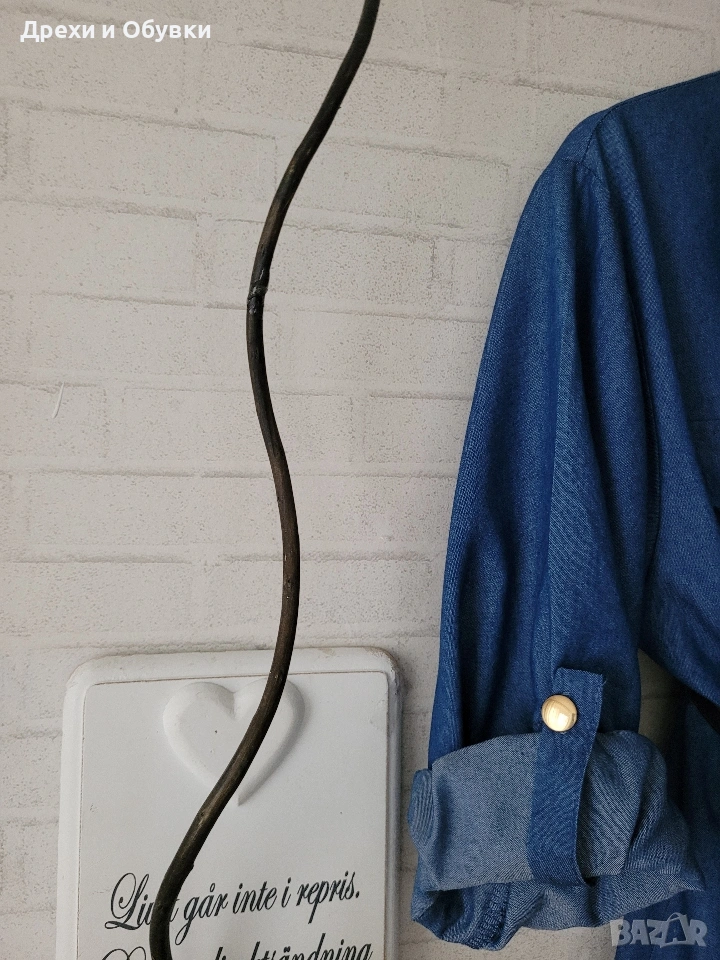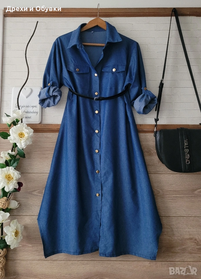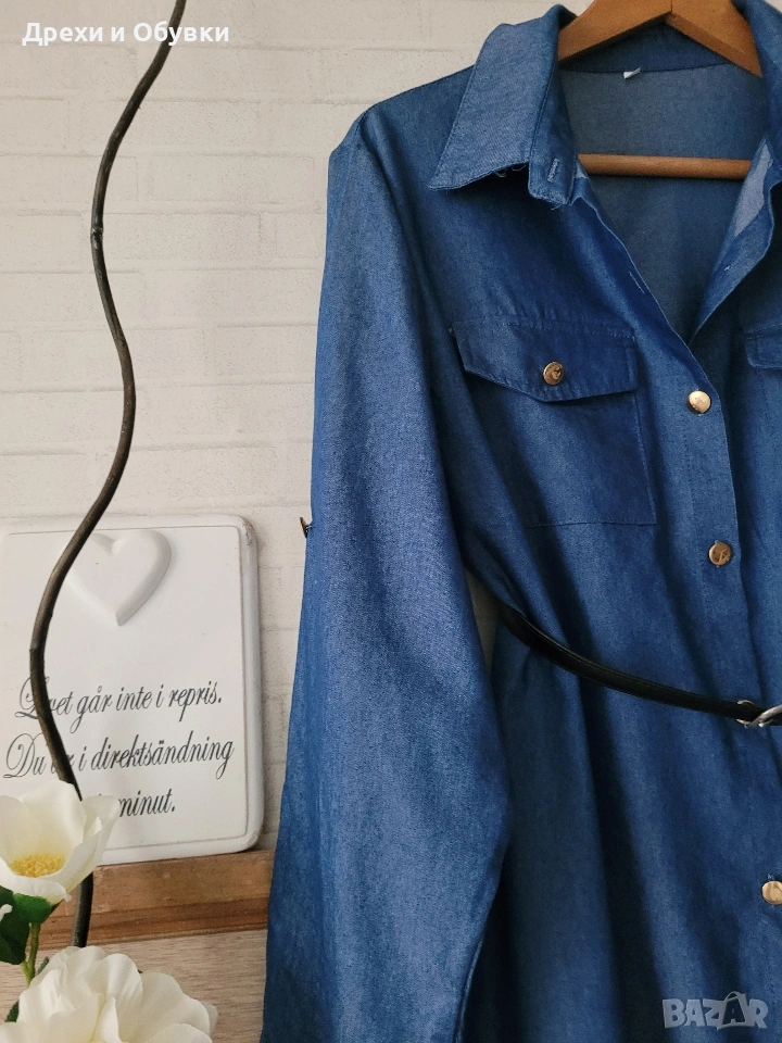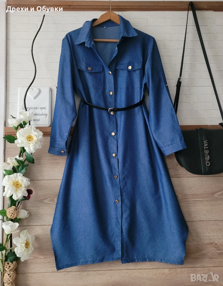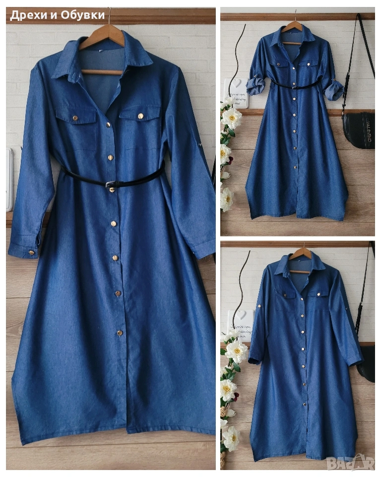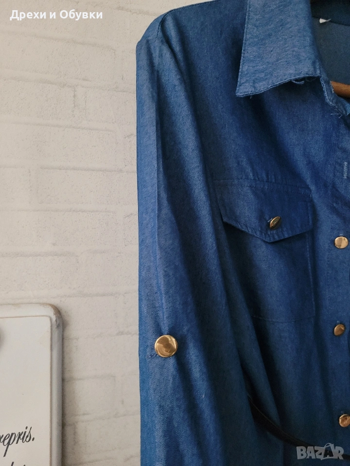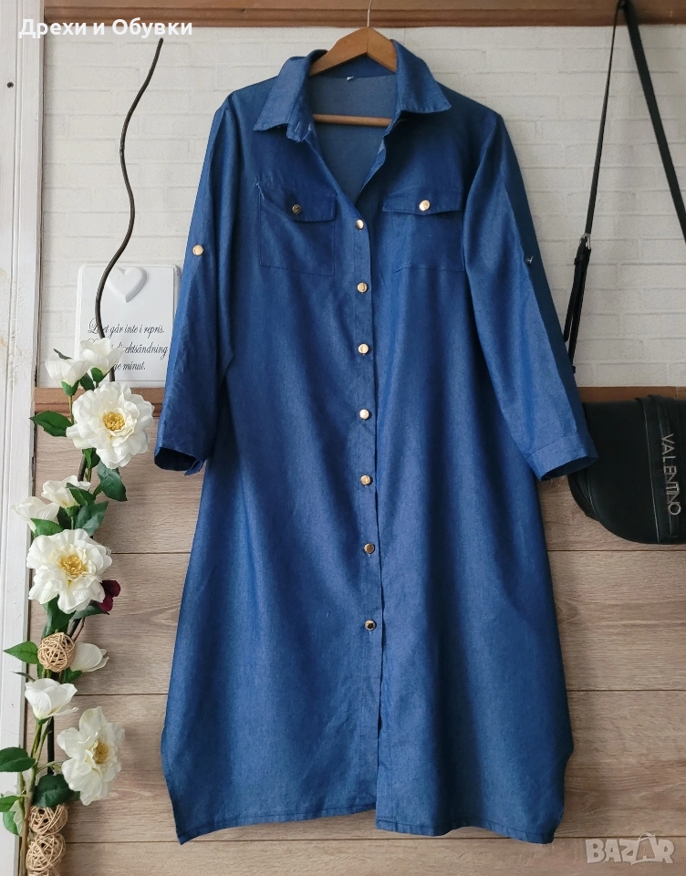 Нова лятна рокля тип риза. Модела е в дънков стил с два предни джоба и цялостното закопчаване златисти копчета. Ръкавите са дълги с опция навиване посредством копчета. За ежедневието с кецове, сандали или елегантна обувка Размер Л Дълга 100см, гръдна до 98см Цена 20€
