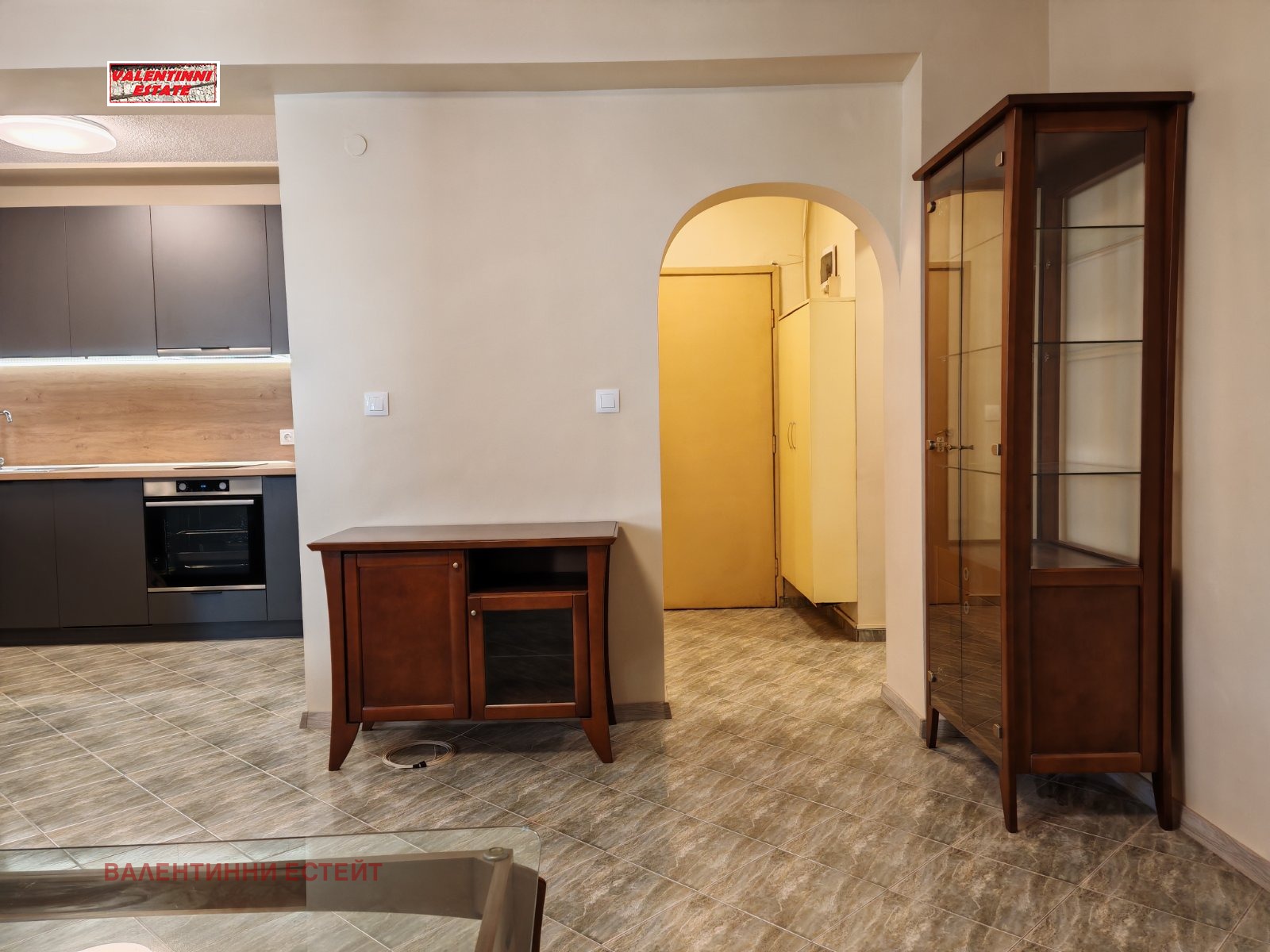 Кухнята е нова, оборудвана с хладилник, керамични котлони и вградена фурна, миялна машина, пералня, кухненски шкафове, абсорбатор и др. Всичко е напълно ново. Дневната е оборудвана с диван, който се разтяга, трапезна маса с четири стола, холна масичка, шкаф, шкаф за телевизор и др. Подът на помещенията е гранитогрес, ПВЦ дограма с щори. Спалнята е оборудвана със спално легло, бюро и нощни шкафчета. Подът на спалнята е от естествен паркет. Баня с тоалетна, с хидромасажна вана, тоалетна, мивка и биде. Складовото помещение, пригодено за гардеребно и склад. В коридора има вградени шкафове за обувки, дрехи и др.
