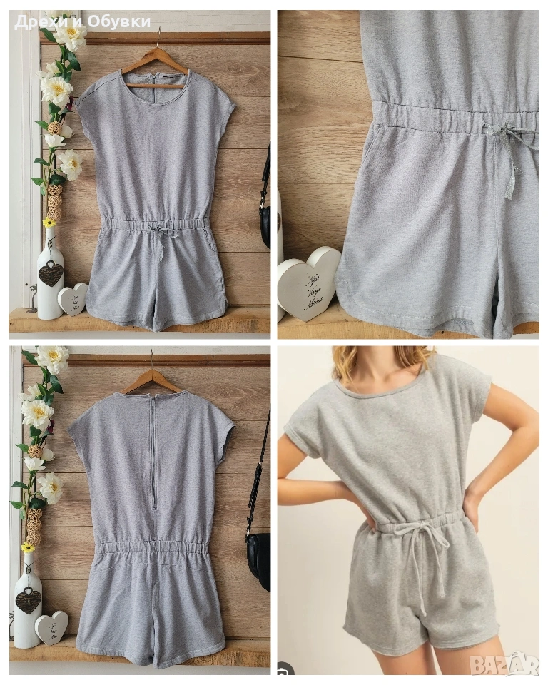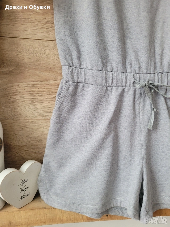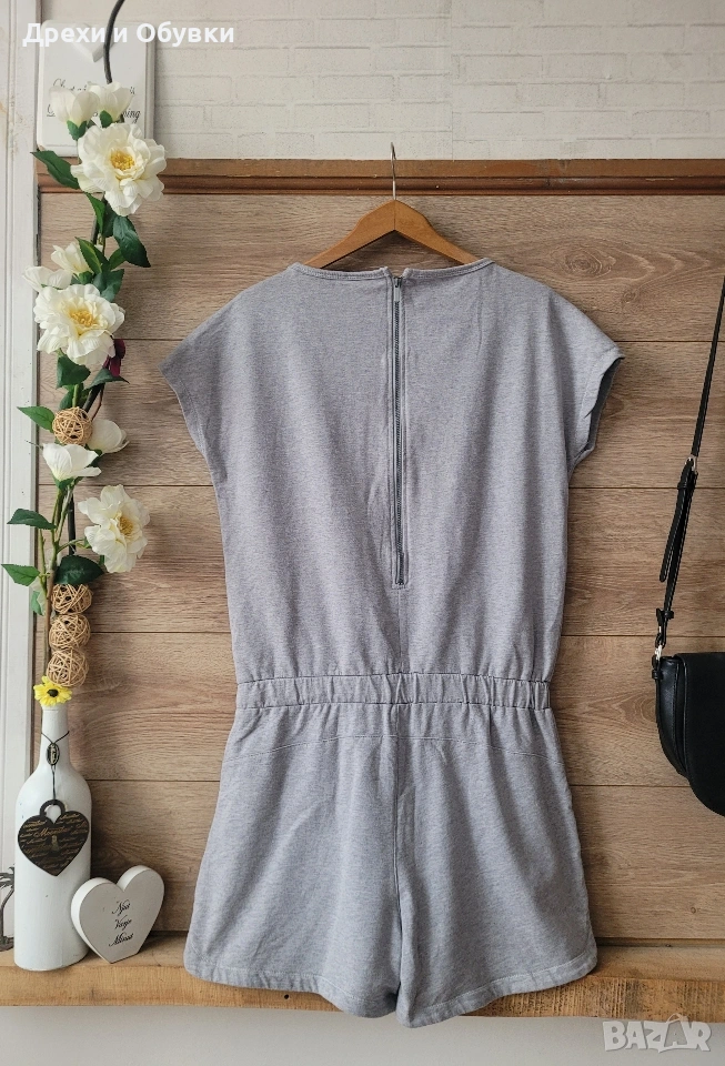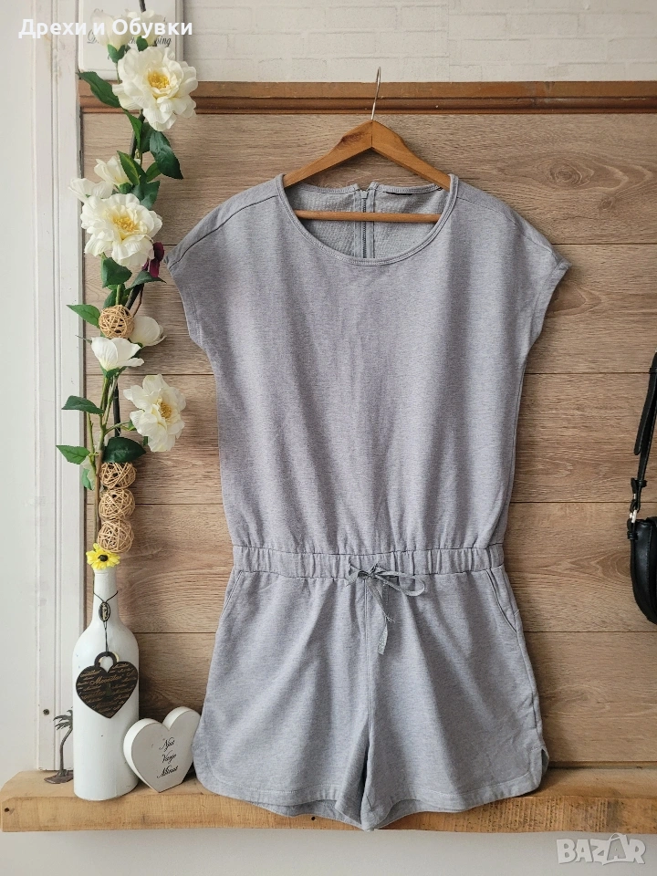 Спортно елегантен къс гащеризон с джобове и ластик в талията. Мнохъбава памучна материя. Закопчаване цип на гърба. За ежедневието с кецове, маратонки или сандали. Размер Л Гръдна 92-98см, талия на ластик 88-90см, обща дължина 84см Материята има еластичност Състояние: като нов Цена 15€