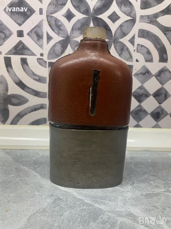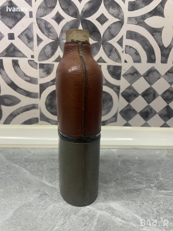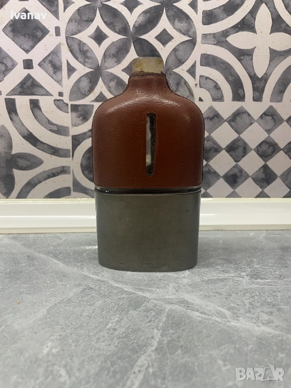 Винтидж преносима бутилка за алкохол С ЛИПСВАЩА КАПАЧКА. Наполовина кожа, наполовина метал. В добро състояние, няма счупвания или скъсани елементи, единственото липсващо е капачката. Бутилката е от 1920 година.