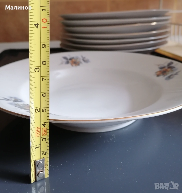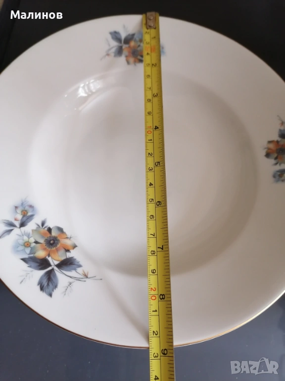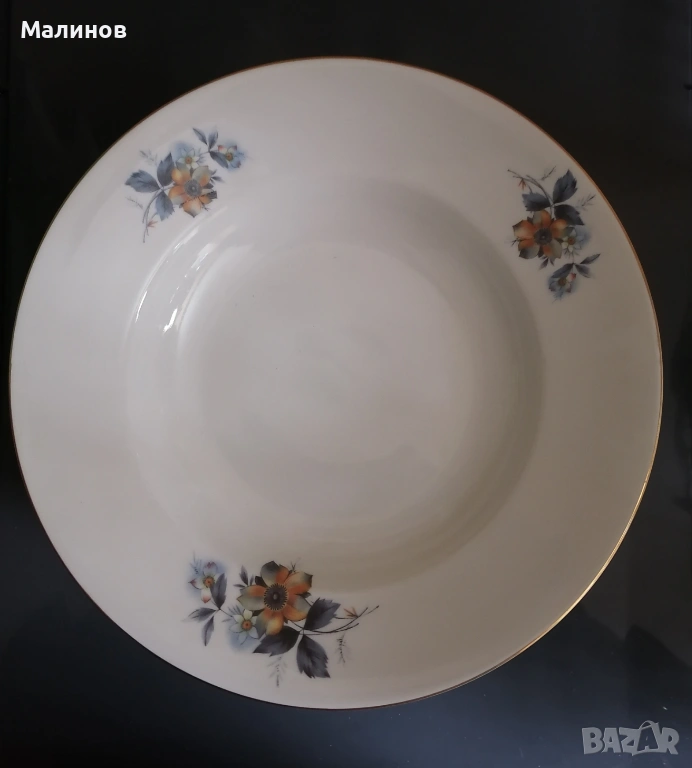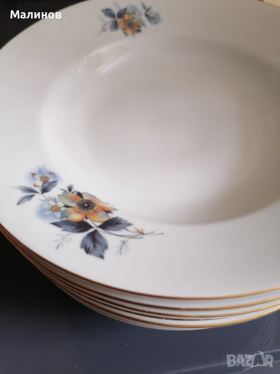 Чинии порцеланови дълбоки, бели, гладки, с украса на цветя по борда. Диаметър 22,5 см, височина 4,2 см. Налични 8 бр., запазени, без забележки.
