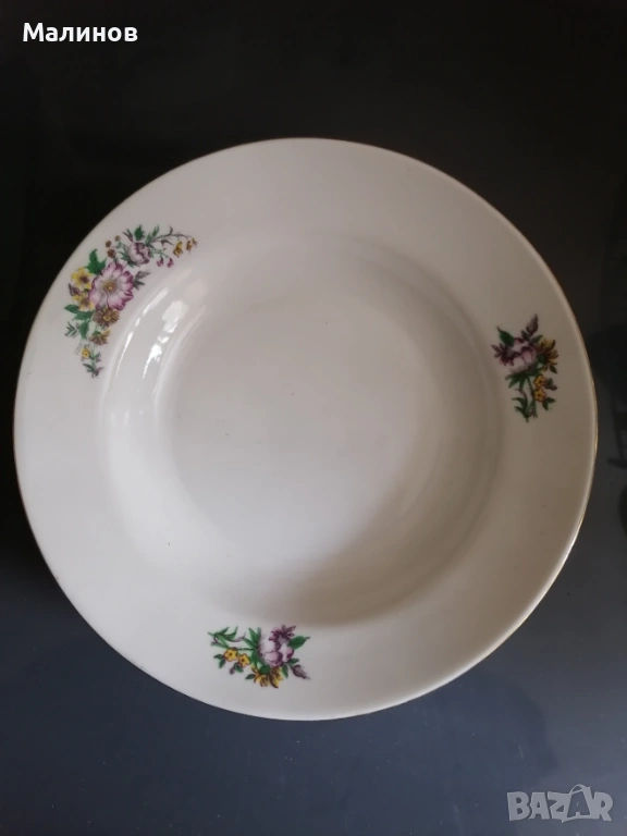 Чинии порцеланови дълбоки, бели, гладки, с украса на цветчета по борда. Диаметър 18,8 см, височина 3,4 см. Налични 5 бр., запазени, без забележки.