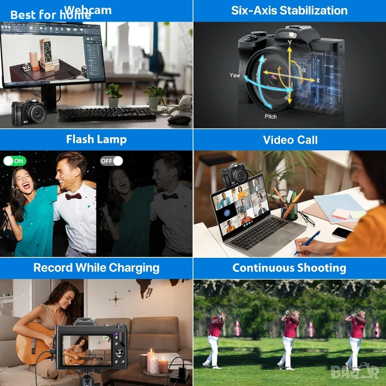 【Цифрова камера с автоматично фокусиране и 16x цифрово увеличение】Камерата за влогове има 16x цифрово увеличение, за да заснема ясно отдалечени обекти, независимо дали снимате спортни сцени или портрети. Функцията за автоматично фокусиране бързо се заключва върху целта и поддържа ясен фокус. Междувременно, функцията за стабилизация по шест оси ефективно намалява размазването при снимане от ръка, независимо дали снимате снимки или видео с движение, и поддържа изображенията стабилни и ясни дори при снимане в условия на слаба светлина или с дълга експозиция.
