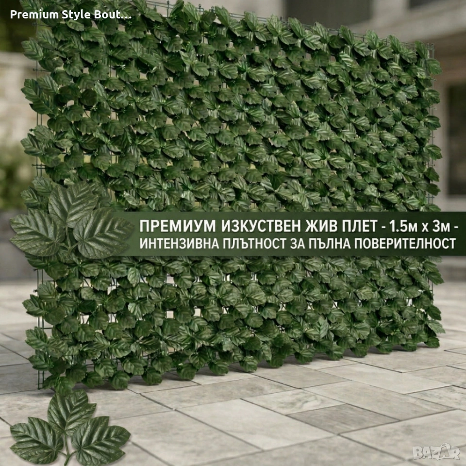 Технически характеристики на Изкуствен жив плет от бръшлян 1.5 x 3 м – UV устойчив, плътна зелена стена за балкон и ограда Размери (т-ки х-ки): 1,5 m x 3,0 m Материал: UV устойчива пластмаса (PVC) Цвят: зелен (наситен, реалистичен) Приложение: вътрешна и външна употреба Функция: поверителност, декорация, защита от вятър и частично затъмнение Монтаж: лесно закрепване към ограда, парапет или мрежа; може да се реже и комбинира Устойчивост: устойчив на атмосферни влияния и UV лъчи Възможност за комбиниране: да, панелите могат да се съединяват за покриване на по-големи площи
