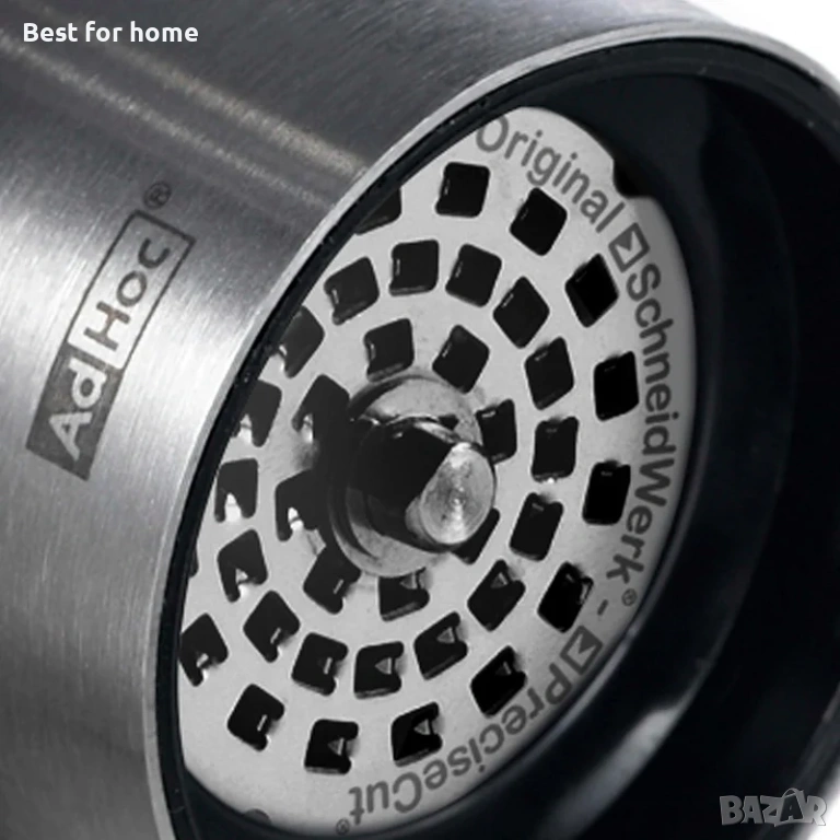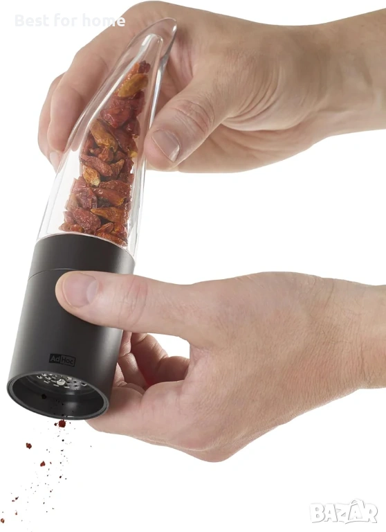 Резачката за люти чушки AdHoc Pepe е снабдена с патентования механизъм SchneidWerk с микроножчета от неръждаема стомана. Тя нарязва сушени люти чушки ултратънко (вместо да ги смила), освобождавайки етерични масла за максимален аромат. Капакът за защита на аромата запазва свежестта, служи като помощно средство за дозиране и поддържа работната повърхност чиста.