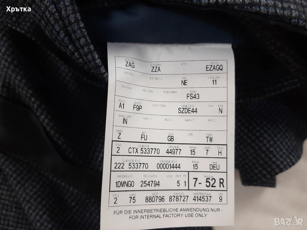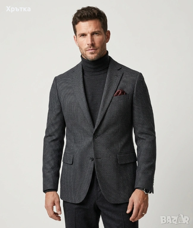 Класически ревери и прецизна италианска изработка, характерна за бранда.
