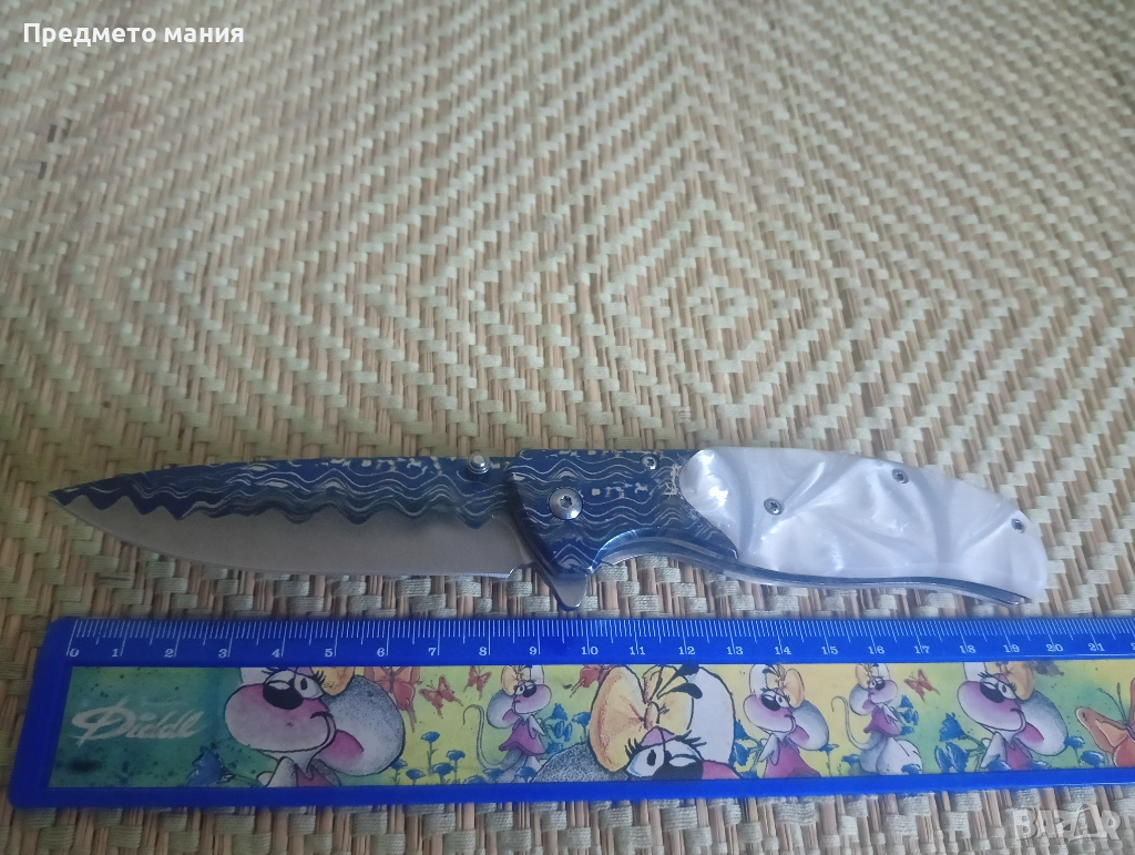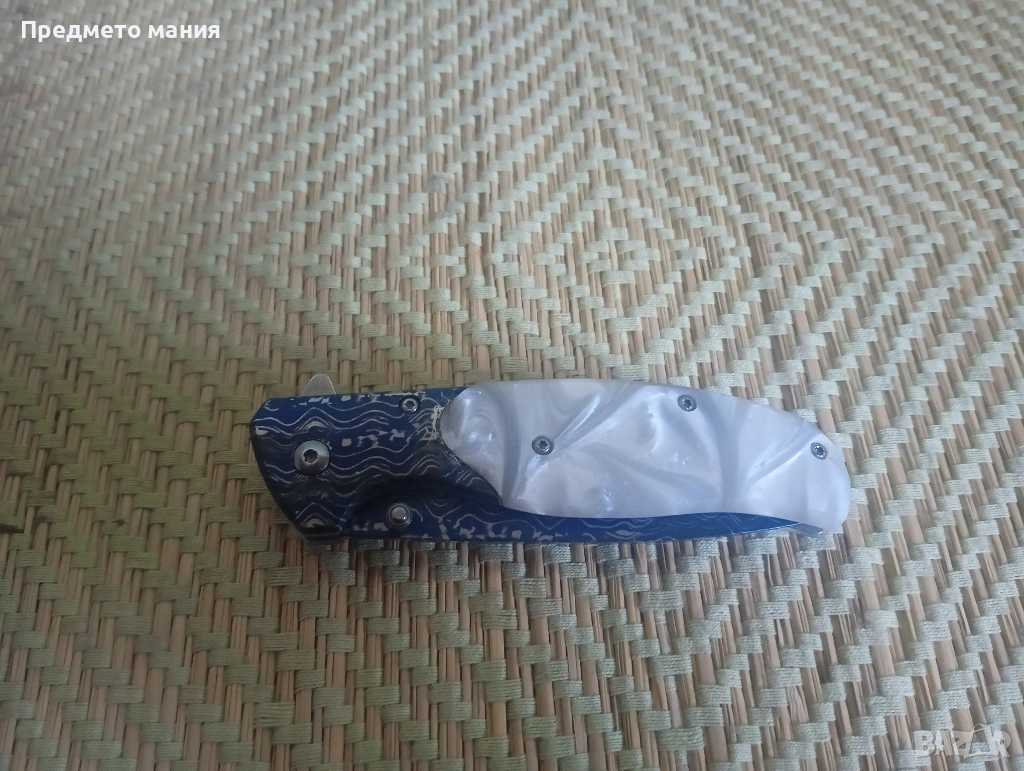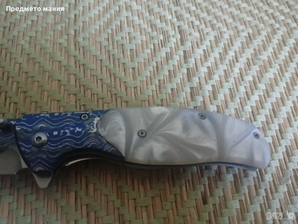 Дръжка: Ергономична, с красиви чирени в цвят „бял седеф“ (перла) и сини метални елементи.