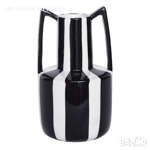 Елегантна керамична ваза с модерен дизайн в класическа комбинация бяло и черно. Отличава се с вертикални контрастни линии и стилни странични дръжки, които й придават дизайнерски и артистичен характер. Подходяща е за съвременни, минималистични и скандинавски интериори.