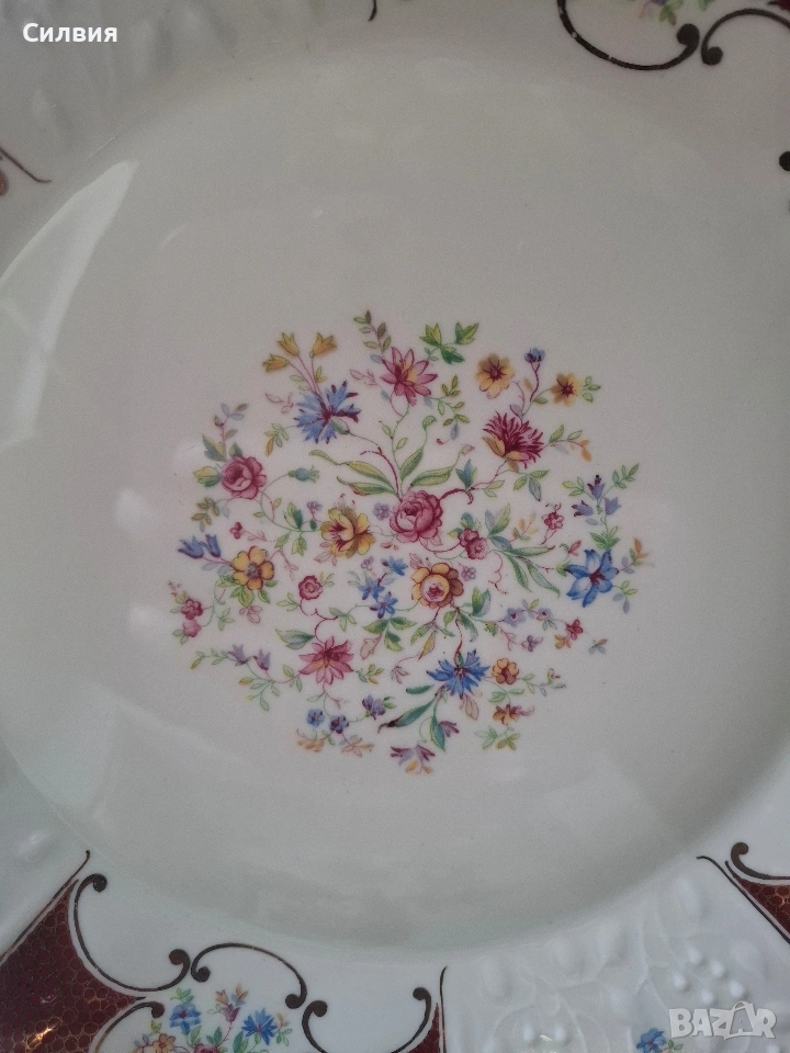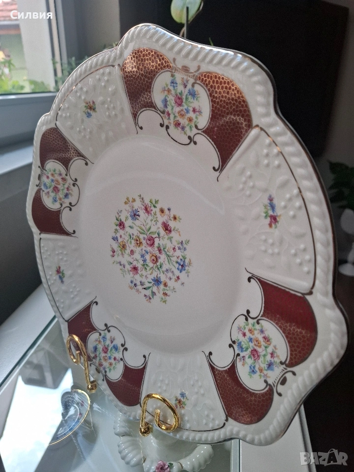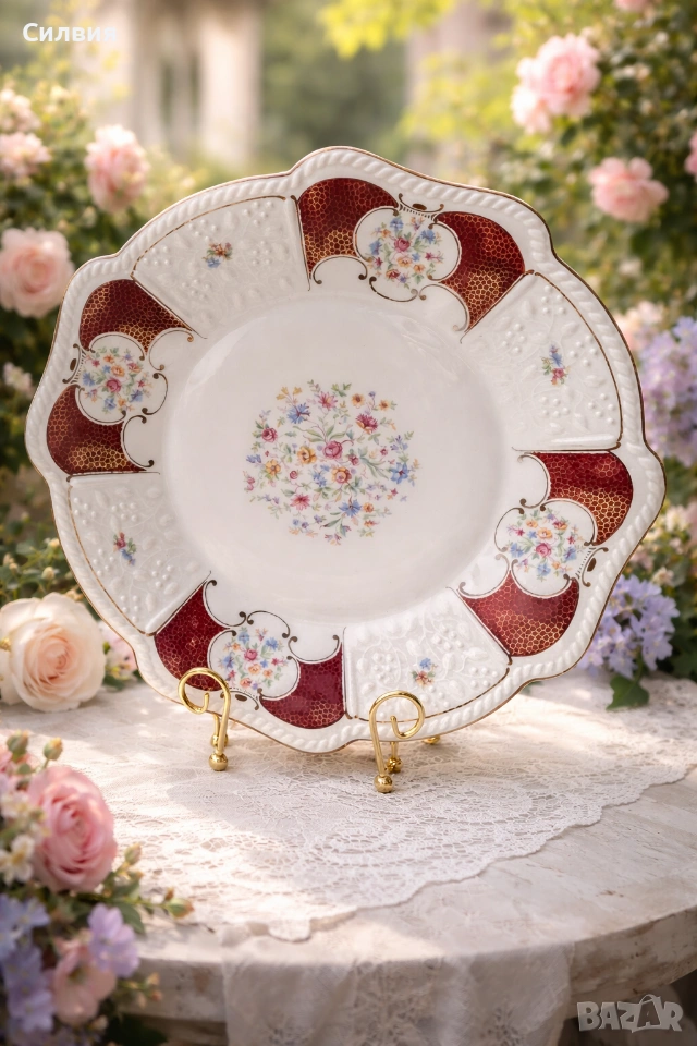 Платото се отличава с изящен и богат декоративен стил. Периферията е оформена с релефни орнаменти и редуващи се панели в дълбок бордо нюанс със златисти акценти. Фините флорални мотиви в пастелни цветове са разположени както по ръба, така и в центъра, където оформят нежен букет с класическа естетика.