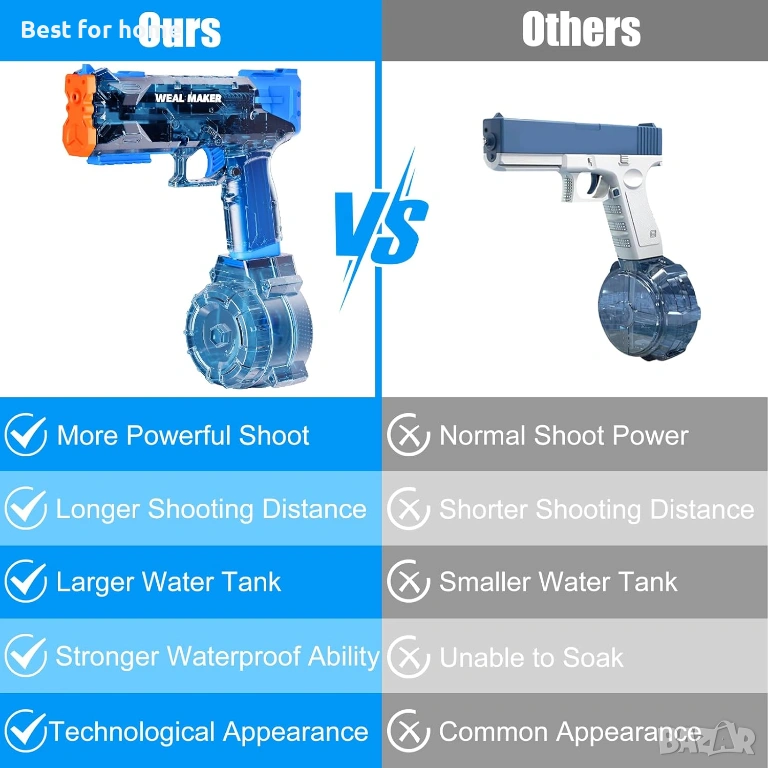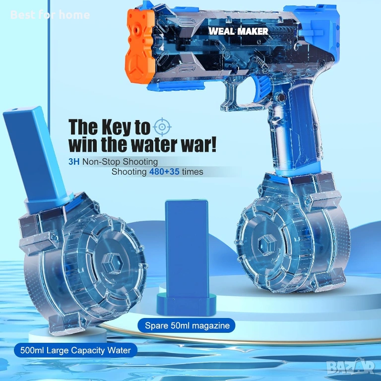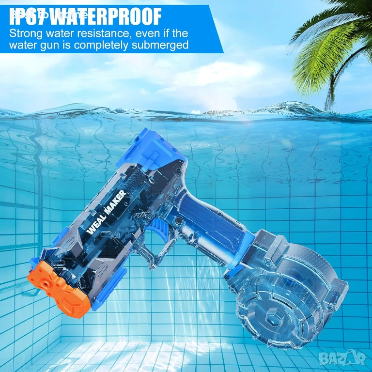 【Силна водоустойчивост】Този воден пистолет има отлична водоустойчивост. Той е прецизно проектиран и ефективно запечатан, за да се гарантира, че няма да бъде засегнат от вода, дори ако водният пистолет е накиснат във вода, няма проблем. За разлика от повечето електрически водни пистолети на пазара, които не могат да се накисват, можете да се насладите на забавлението от бой във водата, без да се притеснявате за производителността и издръжливостта на водния пистолет.