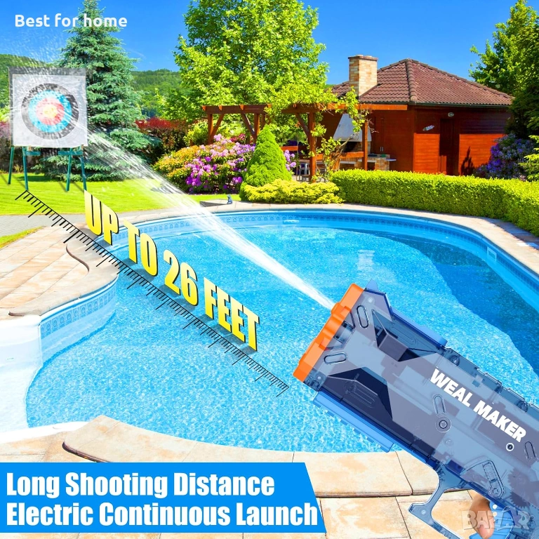 【Мощен електрически воден пистолет】Това е електрически воден пистолет със силна мощност и голям воден дебит. Задвижва се от подобрен електрически мотор, който осигурява отлична мощност на впръскване на вода и отличен обхват на стрелба до 7,2 метра, което е много по-високо от пазарните на други подобни водни пистолети. Независимо дали стреляте на голямо или близко разстояние, този воден пистолет може да ви поднесе изненади отвъд въображението.