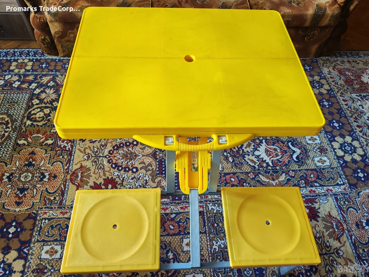 Продавам няколко пъти ползвана цветна сгъваема на куфър маса за къмпинг с 4 стола(с фиксатори за застопоряване) с отвор за чадър.