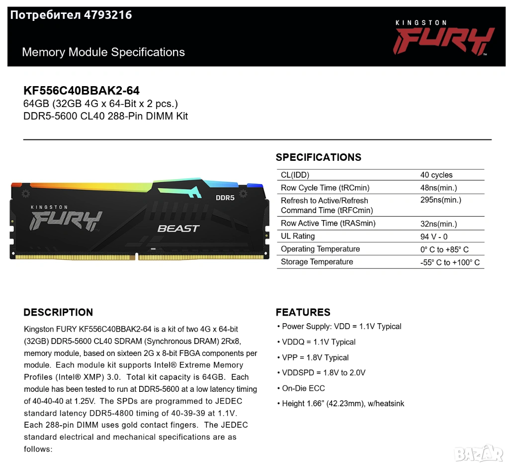2x32GB DDR5 Kingston ARGB 5600 CL40 - 500€ 2-ТЕ ИЛИ 270€ 1БР гаранция до 2030 МОДЕЛ : KF556C40BBAK2-64 2x32