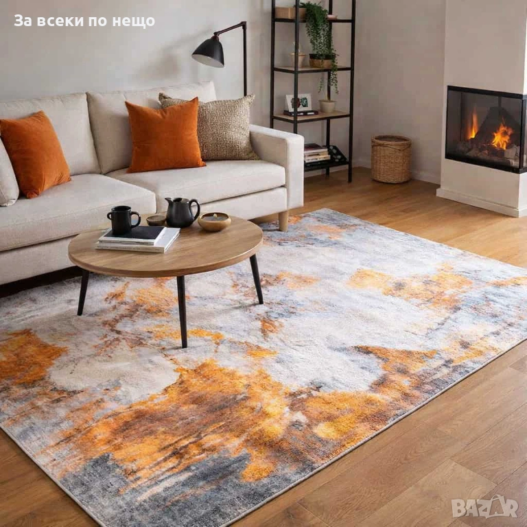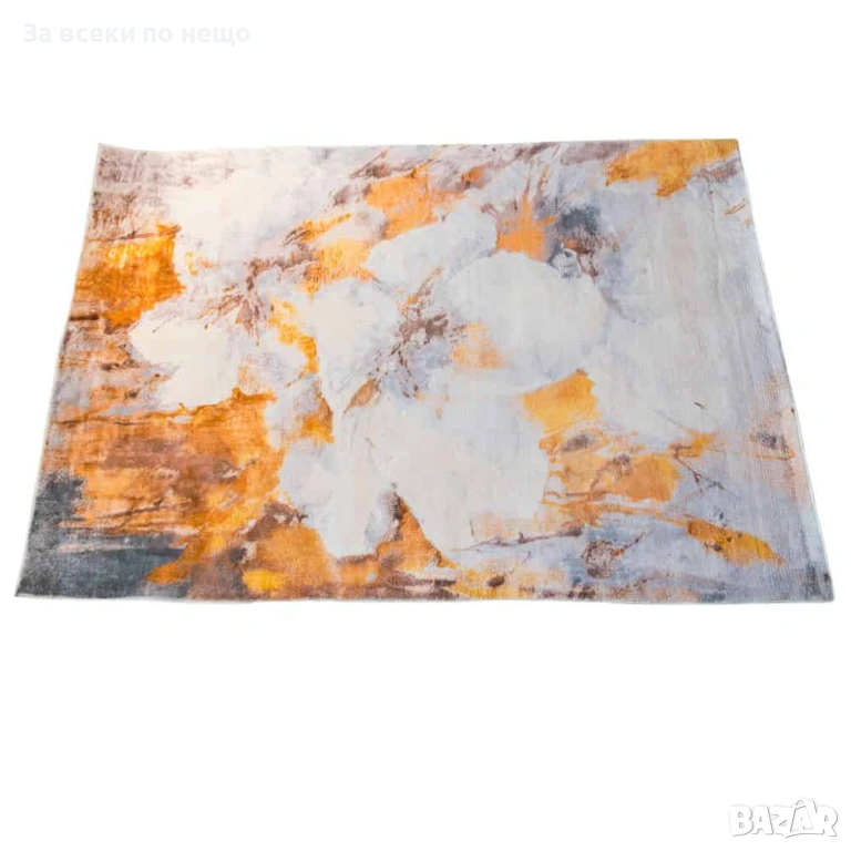 Модерен щампован килим в оранжево и бяло, изработен от висококачествен полиестер. Дизайнът съчетава артистични абстрактни елементи с топли акценти в оранжево, които придават характер и стил на всяко помещение.