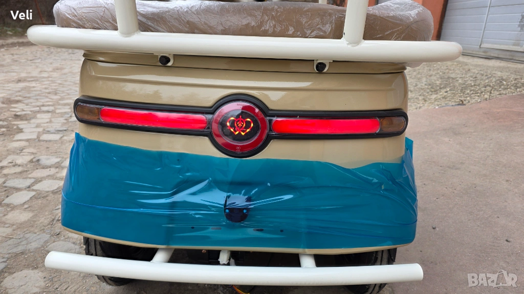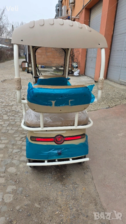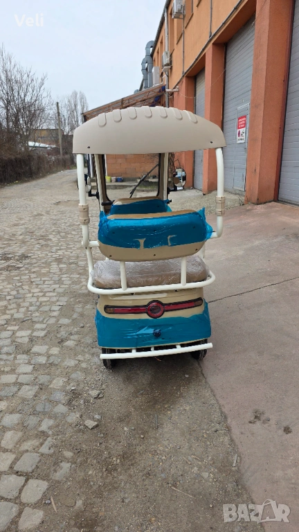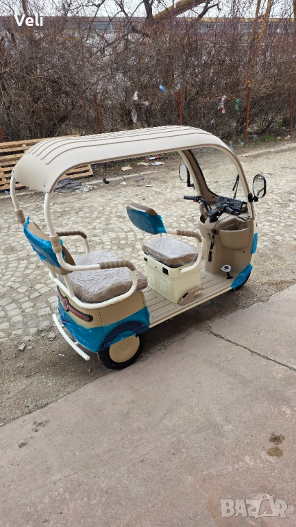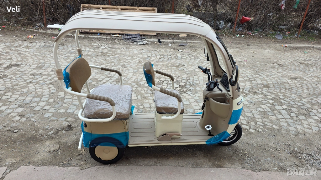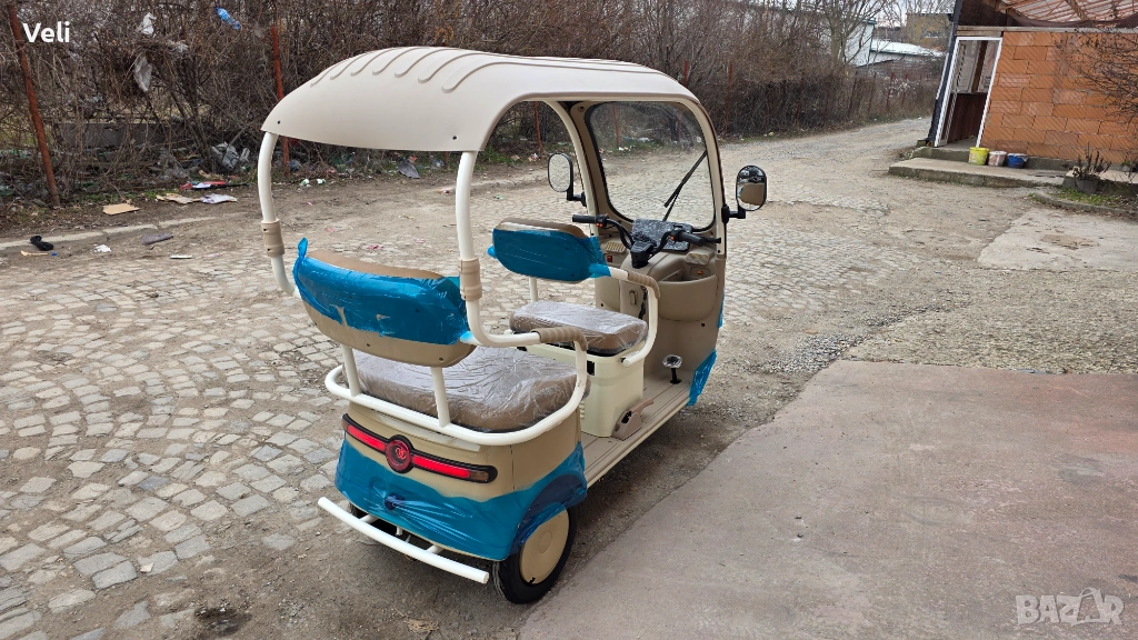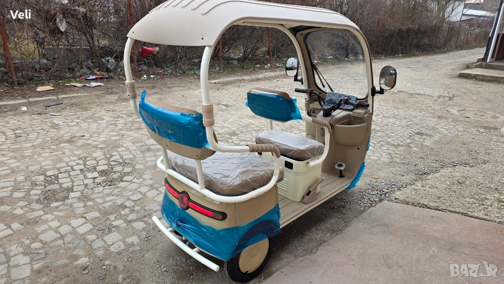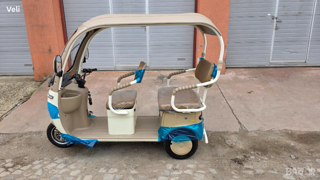 Електрическа триколка за двама с покривна конструкция. Атрактивна и елегантна, тя е подходяща както за ежедневни разходки, така и за атракциони и хотели. Задната седалка лесно се преобръща и се превръща в голямо карго товарно отделение. Мощна, със електродвигател 72V, 3000W MAX POWER, преодолява големи разстояния от 60+ км. и по- стръмни участъци и терени. Висока и проходима, 10" джанти. Има CE сертификат и може да бъде регистрирана в КАТ или обина при необходимост. 2 ключа, 2 бр. дистанционни, аларма и безключово палене.