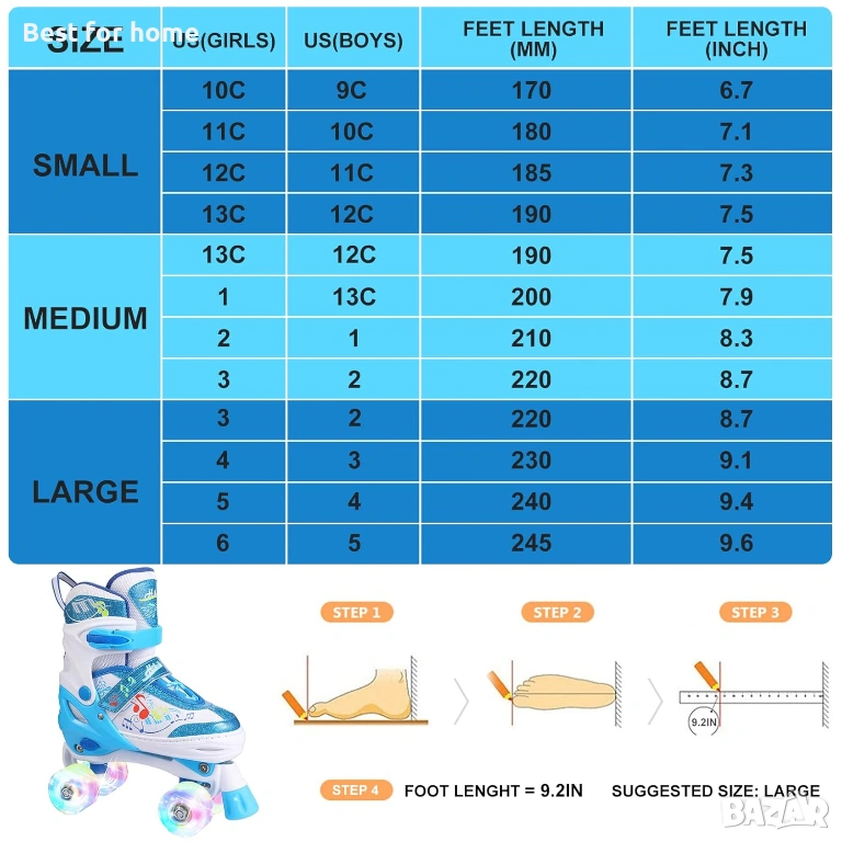 【Регулируеми детски ролкови кънки】 Лесно регулируемият бутон за регулиране на детските ролкови кънки позволява на детето да расте през цялото му детство. Три размера за избор: S: 10C-13C (170 мм-190 мм), M: 13C-3Y (200 мм-220 мм), L: 3Y-6Y (225 мм-245 мм).
