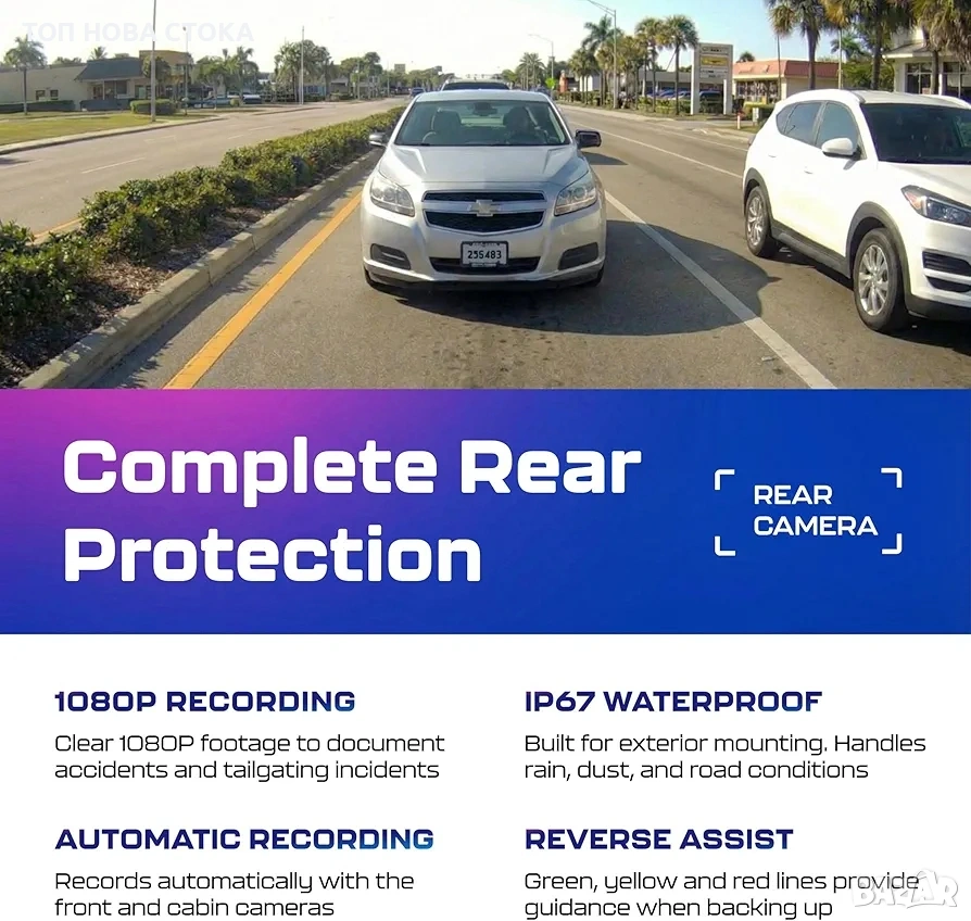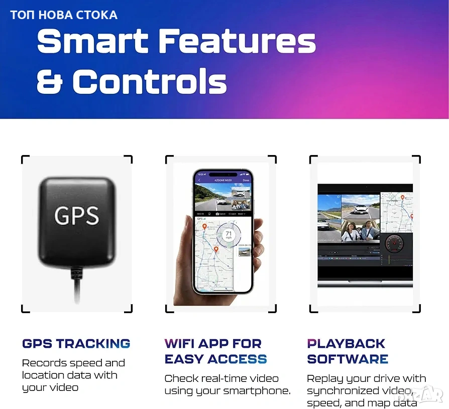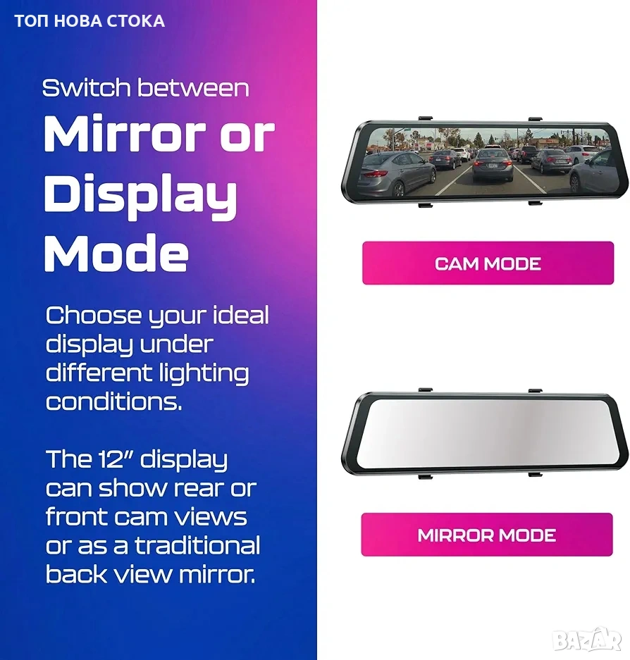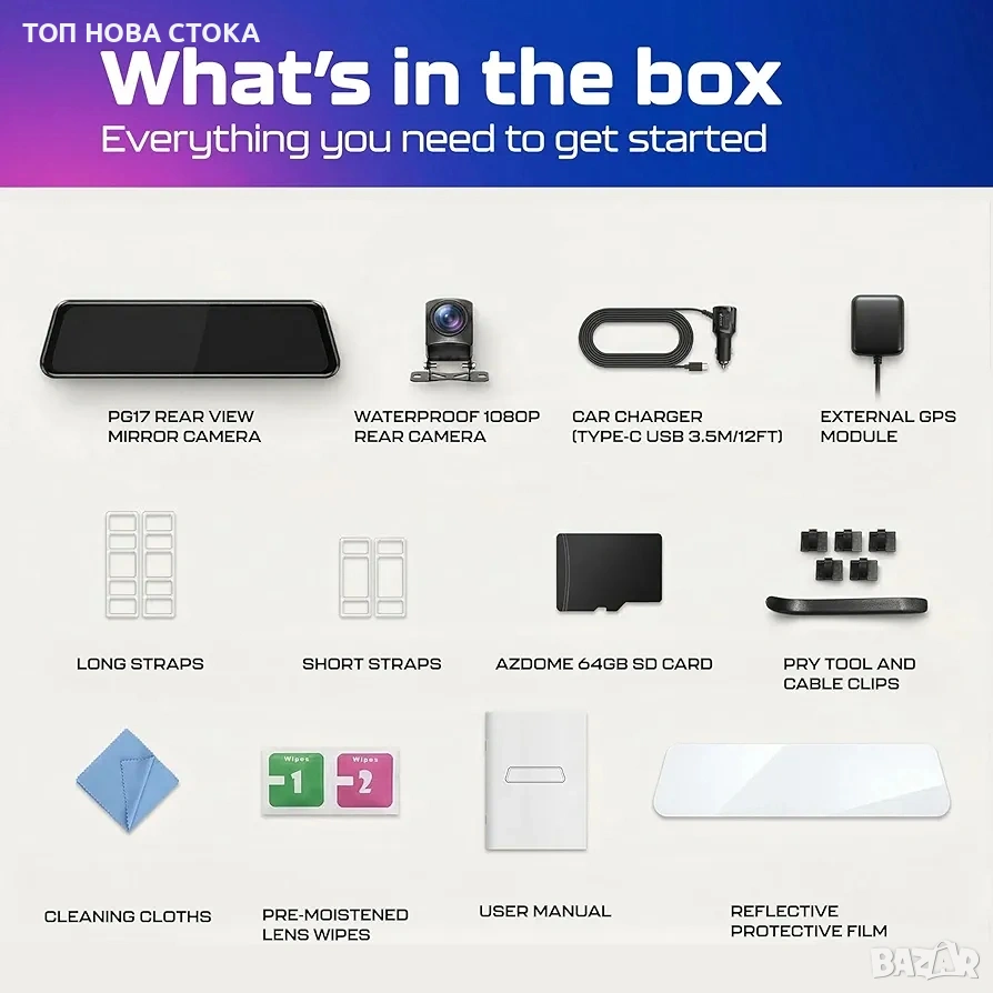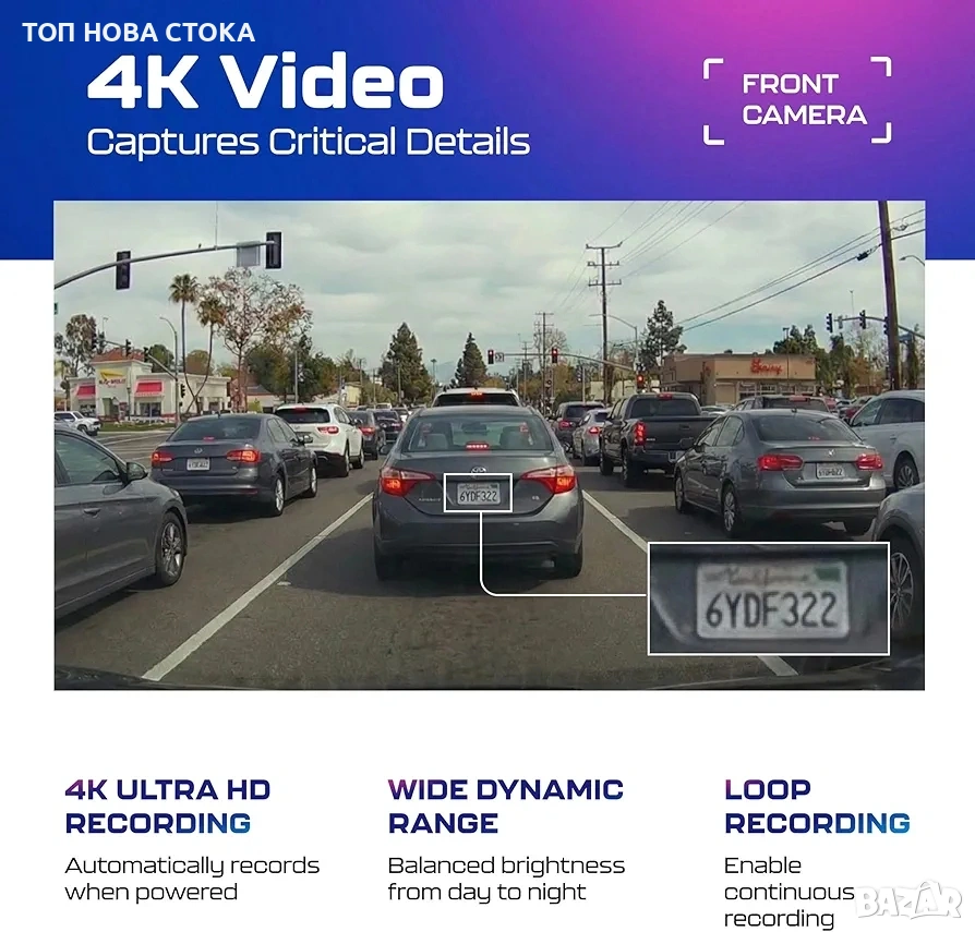 Видеорегистратор AZDOME PG17 4K+FHD, WiFi 6, Нощно виждане, 150°, 12" екран, Специално приложение, G-сензор и наблюдение на паркиране Автомобилната камера AZDOME PG17 е с 11.8" IPS сензорен екран и има вграден Sony Starvis CMOS сензор за изключително качество на изображението. Предната камера е с широкоъгълен 170°, а задната 150°. Автомобилната камера поддържа едновременно показване на изображения от предната и задната камера. Камерата се закрепва директно към огледалото за обратно виждане с ластик. Това няма да навреди на автомобила и няма да пречи на зрението ви по време на шофиране. Работи и като огледало за обратно виждане. Камерата AZDOME PG17 е многофункционална, така че има: LDWS (Система за предупреждение при напускане на лентата) - издава аларма, ако автомобилът ви се отклони от пътя или смени лентата. FCW (Предупреждение за челен сблъсък) - може да ви предупреди, ако има риск от сблъсък с друга кола или препятствие. Линия за паркиране - когато автомобилът е на заден ход, камерата на таблото автоматично превключва към изображението на камерата за задно виждане и показва насочващи линии на екрана. Апертура F1.5, 6 стъклени лещи, двойно HD Двоен HD широкоъгълен обектив улавя повече детайли на пътя, включително регистрационни номера. Зрителното поле е четири пъти по-голямо от това на оригиналното огледало за обратно виждане, което значително намалява сляпото място Супер нощно виждане и WDR Вътрешният сензор SONY STARVIS повишава светлочувствителността на изображението, подобрява изображението при условия на слаба осветеност. Идеален за снимане по здрач, тъмнина или нощ и в тунели. Точна помощ при паркиране Изображението на камерата за задно виждане ще се активира автоматично, а при движение на заден ход на екрана се показват насочващи линии, за да се осигури безопасно и удобно паркиранe Циклично записване Тази функция ви позволява да разделите дължината на видео файла (в зависимост от вашата настройка), така че камерата на таблото да записва непрекъснато. Забележка: Видеорегистраторът ще продължи автоматично да изтрива най-старите файлове (с изключение на заключените видео файлове), когато картата с памет е пълна. 24/7 монитор за паркиране По време на паркиране, ако има удар, камерата на таблото автоматично ще започне да записва за 1 минута (на базата на вътрешната батерия) и ще запази видеото. G сензор Когато превозното средство е изложено на удар, сензорът може незабавно да запише и запази това видео, за да ви предостави полезни доказателства.