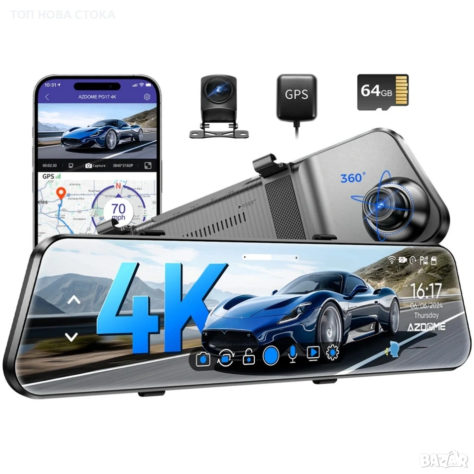 Видеорегистратор AZDOME PG17 4K+FHD, WiFi 6, Нощно виждане, 150°, 12"