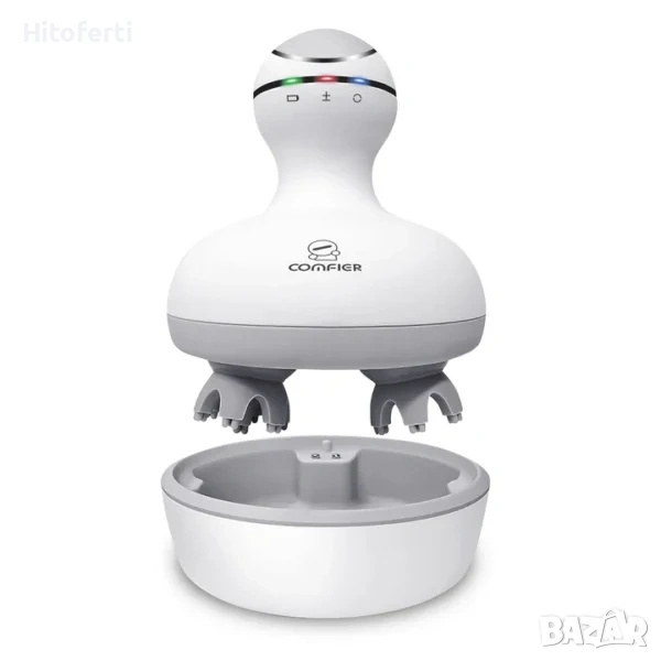 Дълбок масаж на скалпа: Масажорът за глава COMFIER за облекчаване на стреса на скалпа има четири масажиращи глави с 28 отделни възела всеки, които се въртят както по посока на часовниковата стрелка, така и обратно на часовниковата стрелка, осигурявайки ви релаксиращ масаж за стимулиране на растежа на косата, дълбоко почистване на косата и облекчаване на стреса и болката.