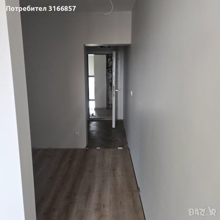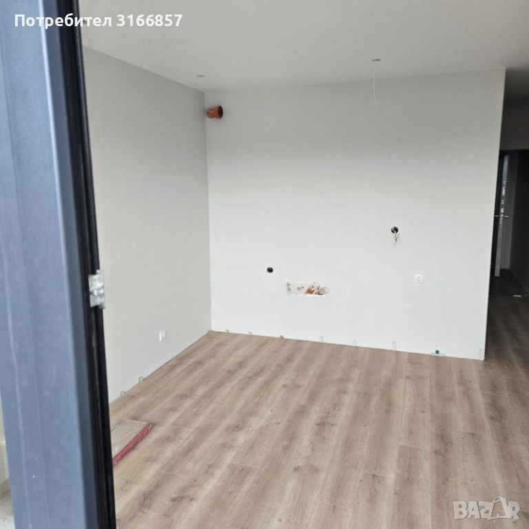 Преградено е на две - кът за спалня и всекидневна. Има хубава тераса, към която се излиза посредством плъзгане тип фолксваген, което дава допълнително пространство към всекидневната. Банята е готова, остава да се монтира санитарията. Нареден е ламинат 12мм. Има окачен таван с изолация на тавана, боядисано е навсякъде.