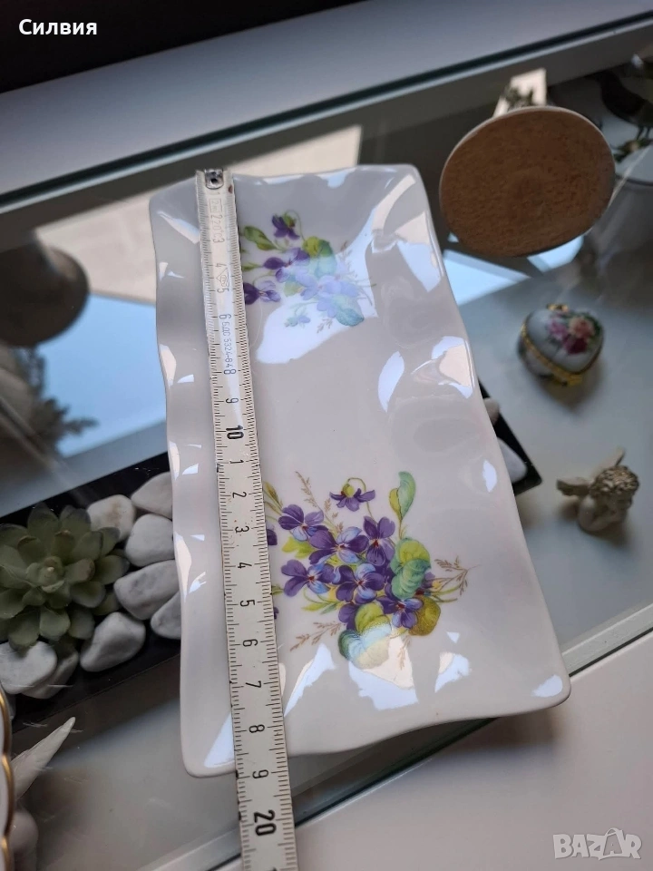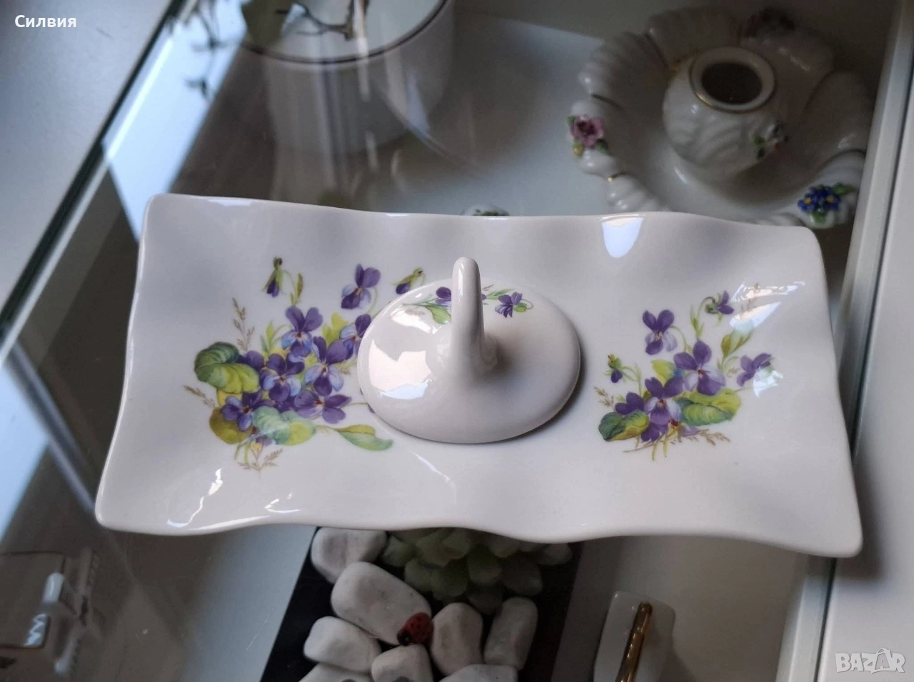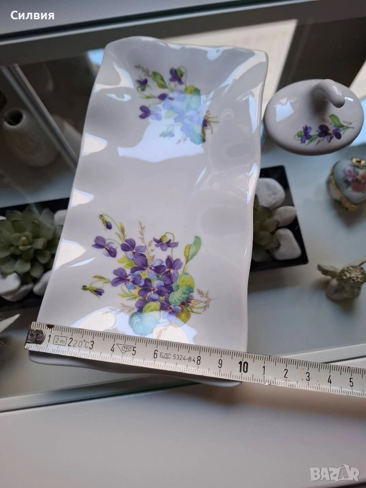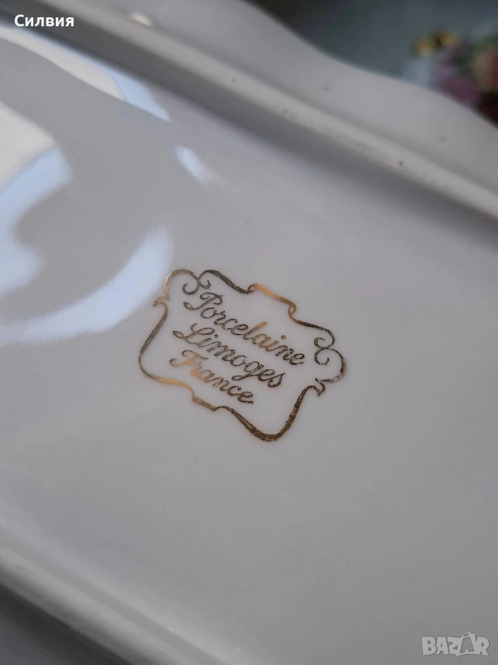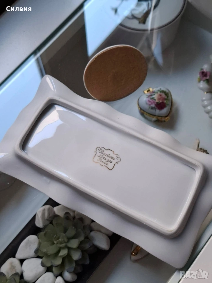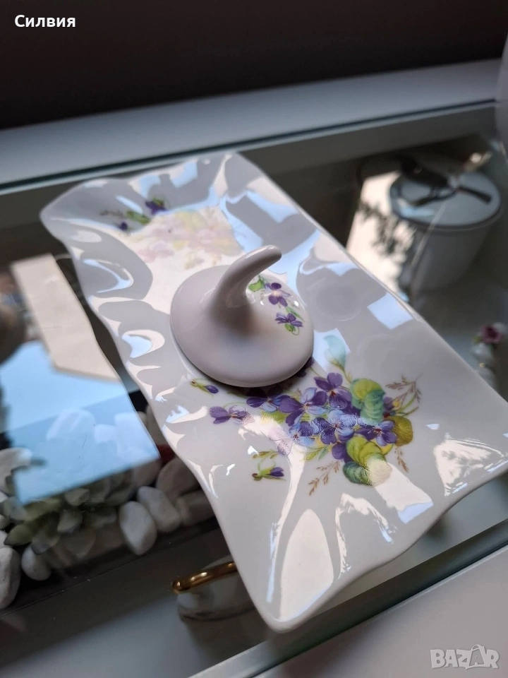 Винтидж порцеланов сет Limoges France – Поставка и Закачалка Изработени от фин бял порцелан в световноизвестния френски център Limoges. Декориран с класическия и много нежен мотив "Горски теменужки". 🪻Теменужките са традиционен винтидж мотив, който символизира скромност и вярност. Комплектът включва: Продълговата поставка (плато) с вълнообразен борд – идеална за сапун, бижута или аксесоари. Уникална порцеланова закачалка със самозалепваща се основа – подходяща за кърпа или леки накити. Изключително рядък елемент! Нищо не носи усещането за вечна елегантност така, както финият порцелан от Limoges. Този сет с нежни теменужки е истинско бижу – комбинация от функционалност и изкуство. Перфектен за съхранение на любимите ви пръстени или като изискан детайл в банята. Състояние: Перфектно, без никакви забележки, чипове или изтривания на декорацията. Стил: Класически винтидж, подходящ за интериори в стил Прованс или Шаби шик. Прекрасно допълнение към Вашата колекция или стилен подарък за ценители на качествения европейски порцелан. Цена 3️⃣0️⃣€ 58,68лв 🪻ღꕥ⊱❥─❥⊱🪻✿⊱╮☆♪ ░L░o░V░e░❥─❥⊱🪻✿⊱╮🪻☆♪ღ🪻ღ꧂ღ