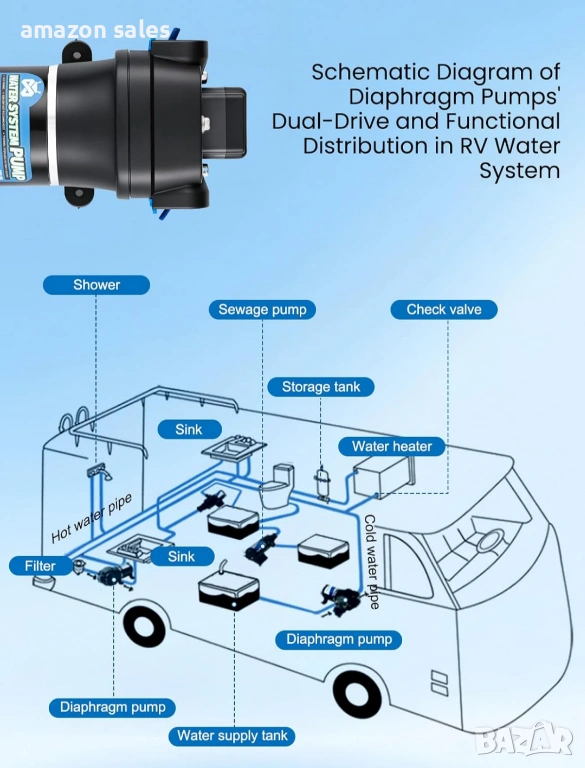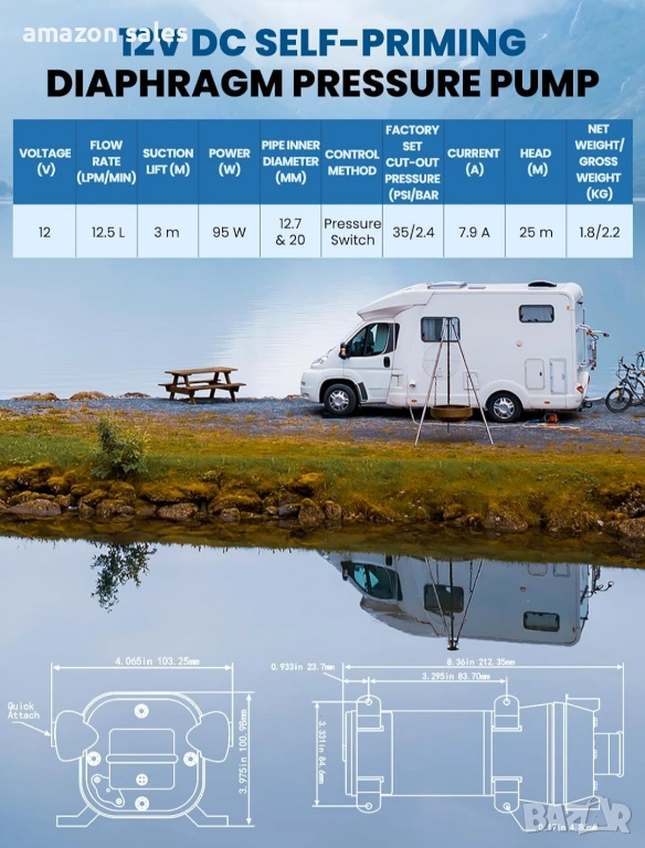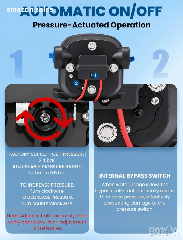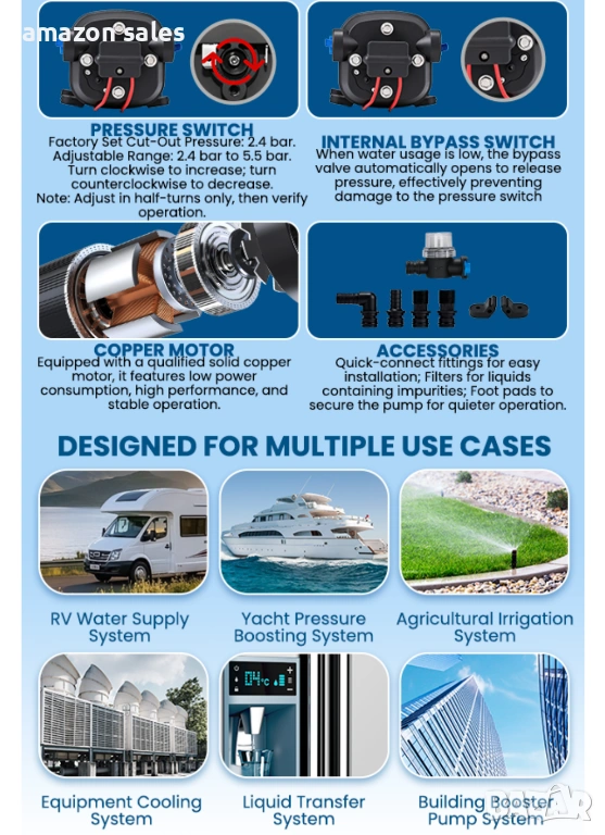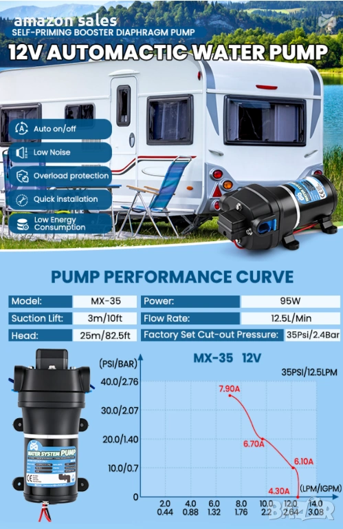 - Силно засмукване и нисък шум: Моля, изберете параметрите, подходящи за вашия караван, за да увеличите максимално ефективността на помпата. Водната помпа е с мощност 95 W, височина на засмукване 3 м/10 фута, височина на изпускане 25 м/82,5 фута и максимален дебит 12,5 л/мин. Налягането е 35 psi/2,4 бара, което е доста подходящо и стабилно за ежедневна консумация на вода в каравани, яхти и др. Налягането може да се регулира от 2,4 кг до 5,5 кг. Когато машината работи нормално, шумът е около 55-60 db. Минимален дебит 6 л/мин, за да се предотврати удар от вода и повреда.