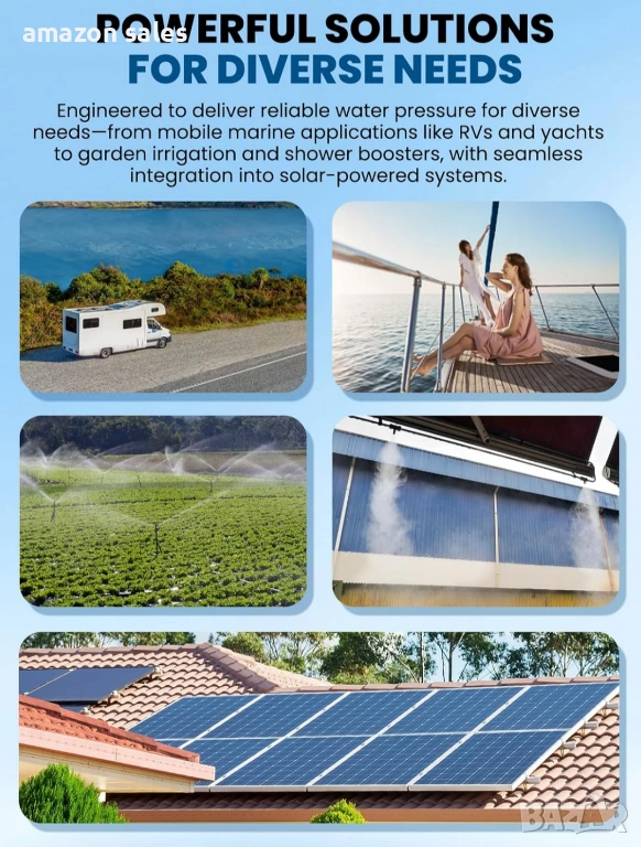 - Широка гама от приложения: тази самозасмукваща помпа има автоматично стартиране/спиране. Тя се включва, когато кранът е отворен, и се изключва, когато кранът е затворен. Идеална за водоснабдяване на кемпери, повишаване на налягането на яхти, напояване в селското стопанство, циркулация на охлаждаща вода за оборудване и подаване на течности.