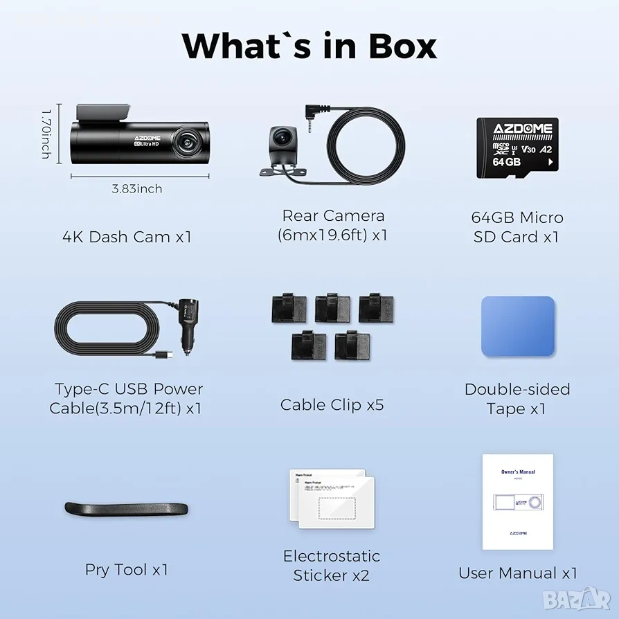 Вземете за колата си малка и дискретна камера AZDOME M300S в комплект със задна камера и записвайте всяко транспортно събитие. Никога не знаете кога записът ще ви бъде полезен. Благодарение на дискретния си дизайн, предната камера не отвлича вниманието ви по време на шофиране и можете напълно да се съсредоточите върху пътя. 4K Dash Cam в комплект със задна камера Въпреки че предната камера M300S е малка, тя записва видео с много високо качество благодарение на резолюцията 4K 3840×2160P при 25 кадъра в секунда. Благодарение на своя ъгъл на видимост от 170°, тя безопасно записва случващото се и в трите ленти за движение. За най-добър изглед при запис, предната камера може да се върти вертикално под ъгъл до 120° след монтиране на прозореца. Пакетът включва и задна камера, която записва случващото се зад автомобила по време на шофиране. Камерата има резолюция 1920×1080P и широк ъгъл на видимост от 150°. След монтаж на задното стъкло на автомобила, обективът на камерата може да се върти вертикално до 360°. Super Night Vision Видеорегистраторът използва технология Wide Dynamic Range (WDR) за подобряване на видимостта при шофиране през нощта. Нощното виждане WDR значително подобрява детайлите на записа дори при лоши светлинни условия. Гласово управление AZDOME M300S поддържа управление на камерата чрез шест гласови команди. Това прави заснемането на снимки и видеоклипове лесно и безопасно. Поддържат се само команди на английски език. Вградена WiFi Този видеорегистратор се предлага и със супер бърза интегрирана 5G WiFi, така че към нея може безжично да се свърже смартфон с операционна система Android или iOS чрез приложението AZDOME. По този начин можете лесно да преглеждате и изтегляте записи директно на телефона си – няма нужда да изваждате картата с памет и да я свързвате към компютър. Приложенията могат да бъдат изтеглени Вграденият GPS на този видеорегистратор надхвърля простото записване на вашето пътуване. Камерата улавя и ключови детайли в записа, като скорост и точно местоположение, предоставяйки ценни доказателства в случай на инцидент. 24-часов паркинг монитор Този модел е оборудван и с функция за 24-часов паркинг режим. Тази функция обаче изисква закупуване и инсталиране на AZDOME Hardware Kit USB-C комплект за захранване на камери в паркинг режим. След свързване и стартиране на режима, камерата поддържа общо 2 полезни функции: G-сензор, автоматично стартира запис, ако някой удари паркирания автомобил на паркинга. Режим на таймлапс запис, по време на паркиране видеорегистраторът може да записва непрекъснато случващото се около автомобила в продължение на 24 часа. Технически спецификации: Модел: M300S CPU: NT96670 Сензор: GC4653 Видео резолюция: предна: 3840×2160p@30fps, задна: 1920×1080p@30fps Бленда: F=1.8 Ъгъл на видимост: 170° Видео формат: MP4 Компресия: H.264 Фото формат: JPG Поддръжка на карти памет: ДА, microSD, макс. размер 128GB Захранване: 5 V, 2,5 (USB-C) Вътрешна батерия: Суперкондензатор Зареждане: CL зарядно WIFI: да LED индикация: да микрофон: да високоговорител: да Гласово управление: да GPS: да, чрез приложението Температура на съхранение: –30℃~ +80℃ Работна температура: –20℃~ +70℃ Размери: 97×30×40 mm