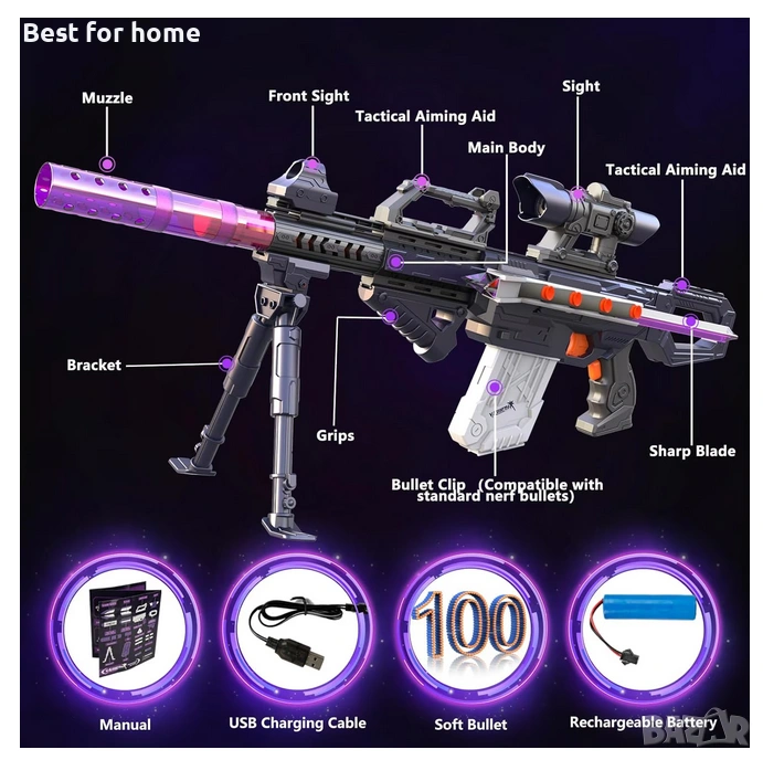 Комплект снайперски бластер, играчка пистолет за многофункционални дунапренови дартс, съвместим с дартс Nerf, с акумулаторна батерия, 100 снаряда, мерник и аксесоари