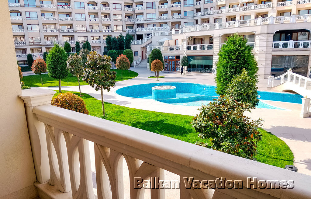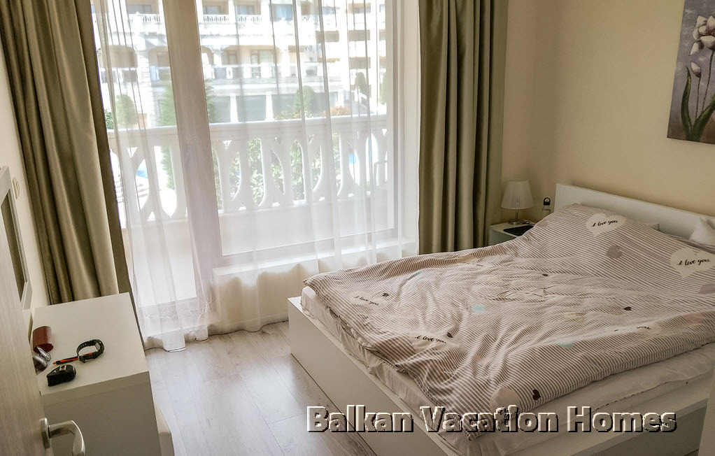 Спалнята има собствен отделен балкон, ориентиран към по-тихата страна на комплекса, с гледка към градината и зоната на басейна.