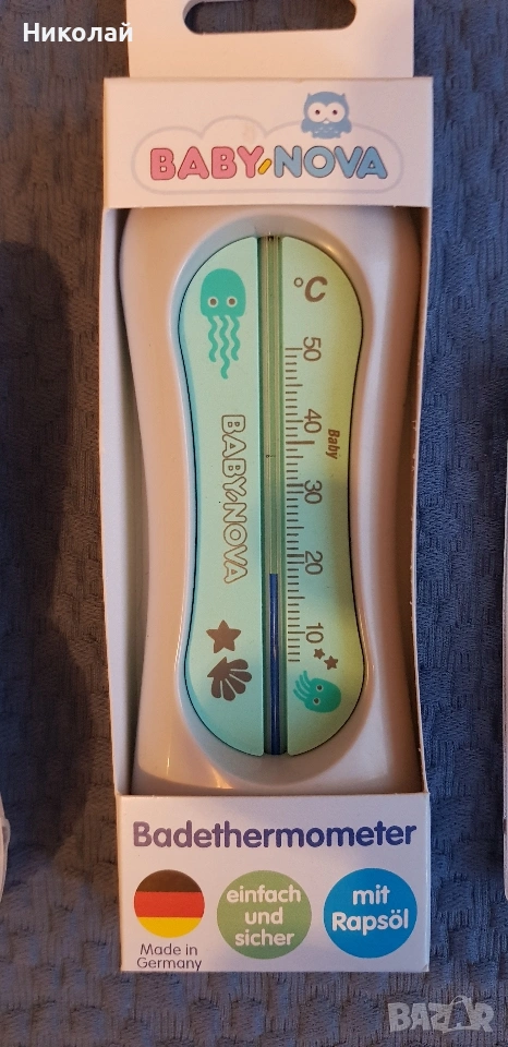 Нов аналогов термометър за баня Baby-Nova , изработен от пластмаса и използващ рапично масло за измерване. Нови залъгалки 4бр.